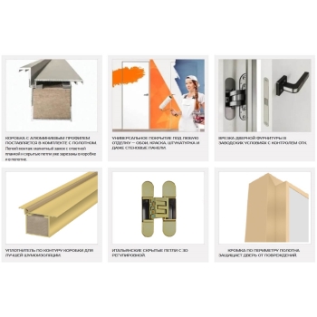 Поставляются с заводской врезкой магнитного WC замка и скрытых петель, коробка с уплотнителем из алюминия с брусом из МДФ.