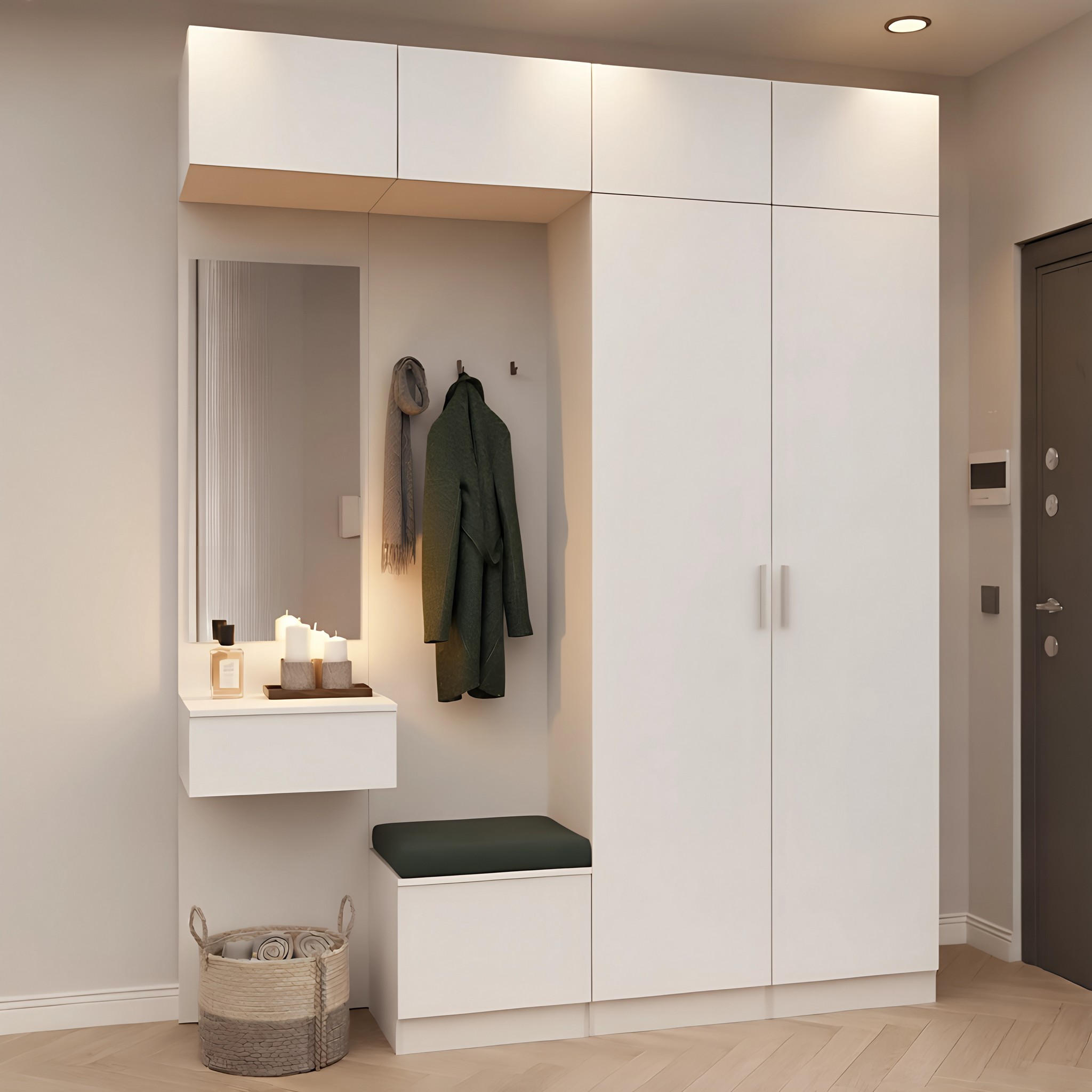 Простая и компактная прихожая вместительна и функциональна, позволит разместить все необходимые вещи: обувь, верхнюю одежду, головные уборы и различные мелкие вещи. Благодаря гармоничному сочетанию цветов прихожая создаст в вашей квартире ощущение уюта, тепла и комфорта.