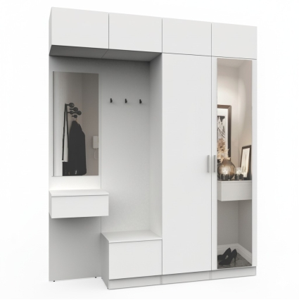 Простая и компактная прихожая вместительна и функциональна, позволит разместить все необходимые вещи: обувь, верхнюю одежду, головные уборы и различные мелкие вещи. Благодаря гармоничному сочетанию цветов прихожая создаст в вашей квартире ощущение уюта, тепла и комфорта.