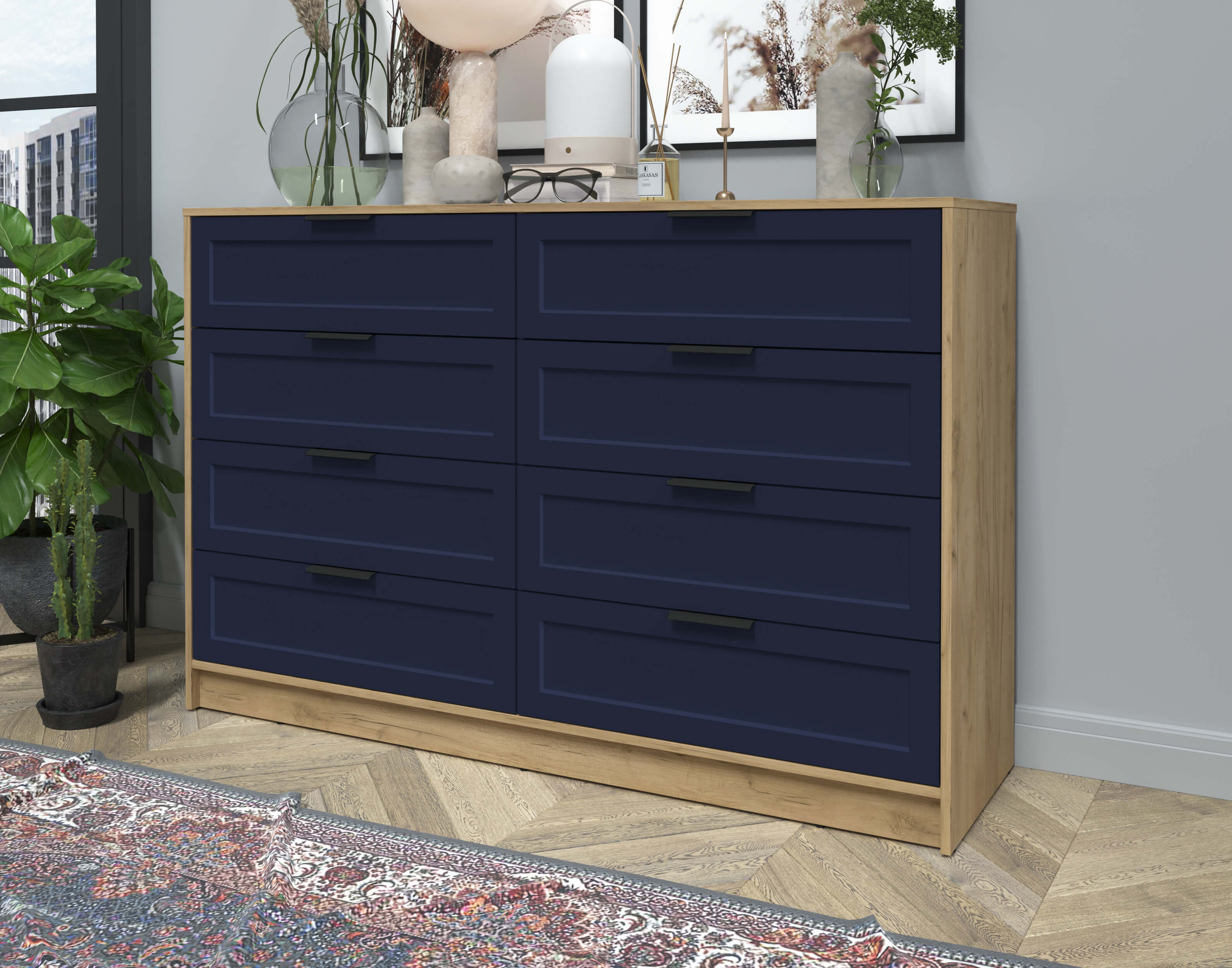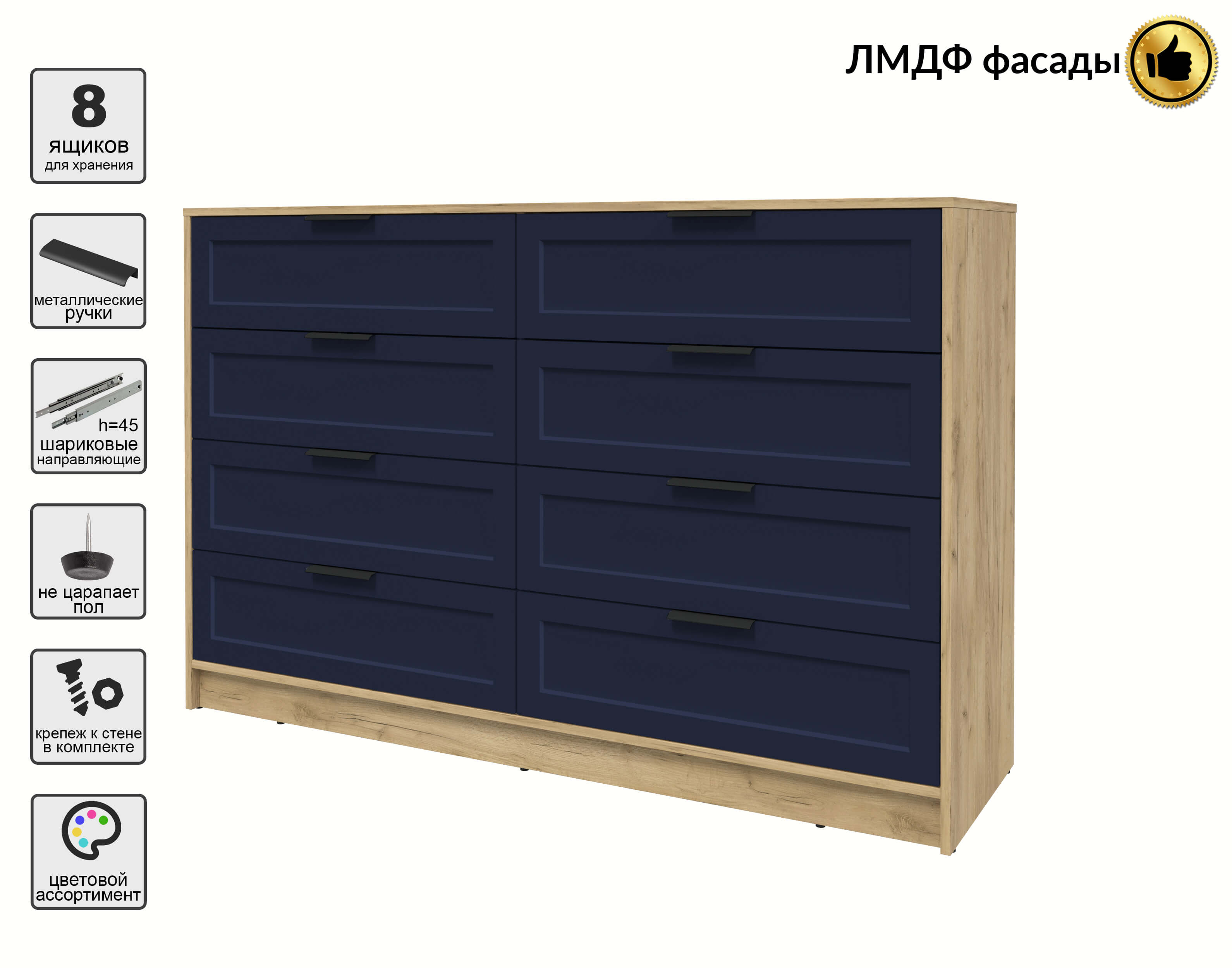 Kомод Тренд КТ-К157 (Дуб золотой ЛДСП/ Индиго ЛМДФ) Ш1565 В1020 Г451