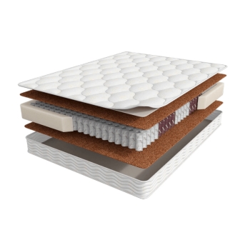 Независимый пружинный блок "Песочные часы" разделён на 5 отдельных зон. Такое зонирование позволяет максимально точно распределить нагрузку и удерживать позвоночник в анатомически правильном положении. Кокосовая плита толщиной 1 см создаёт необходимую жёсткость. Этот натуральный материал является воздухопроницаемым, влагоустойчивым и экологически чистым. Матрас усилен по периметру.