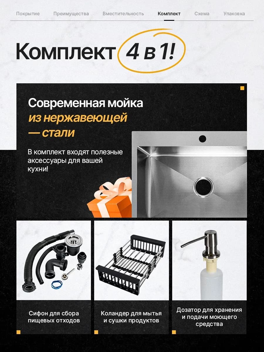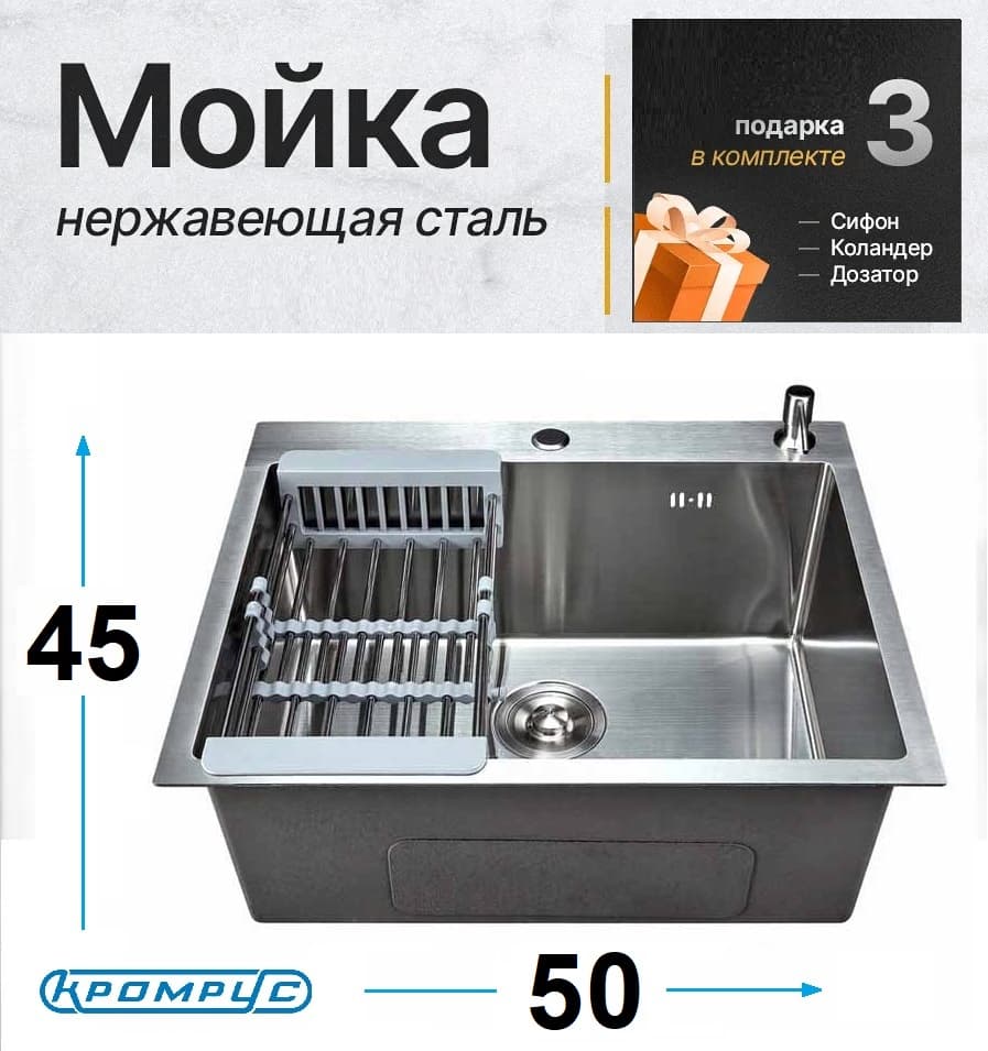 В комплекте с мойкой идет сифон, дозатор для моющего средства и корзина для сушки овощей и фруктов. Выбирая мойку для кухни стальную KromRus 50х45 см, вы получаете стильный и функциональный аксессуар, который прослужит вам долгие годы и сделает процесс мытья посуды максимально комфортным и приятным.