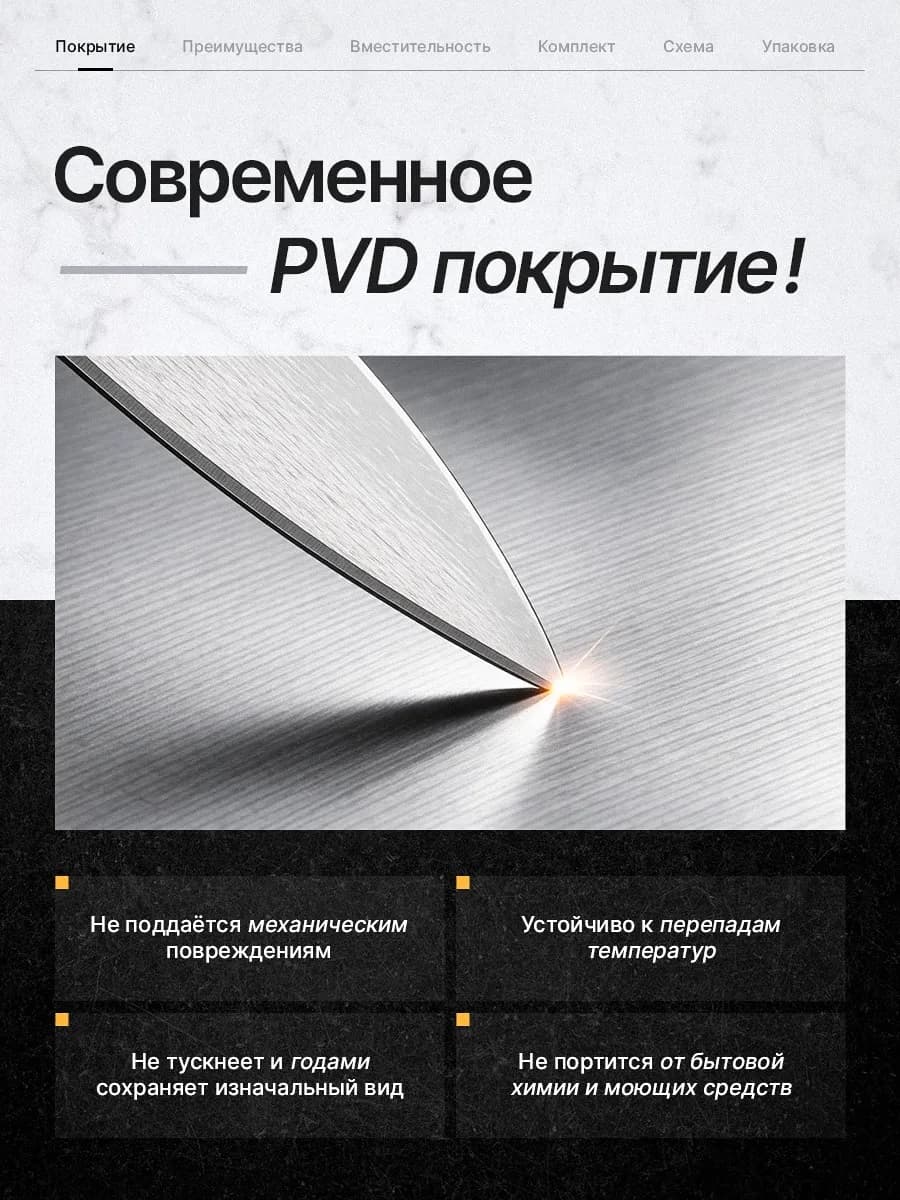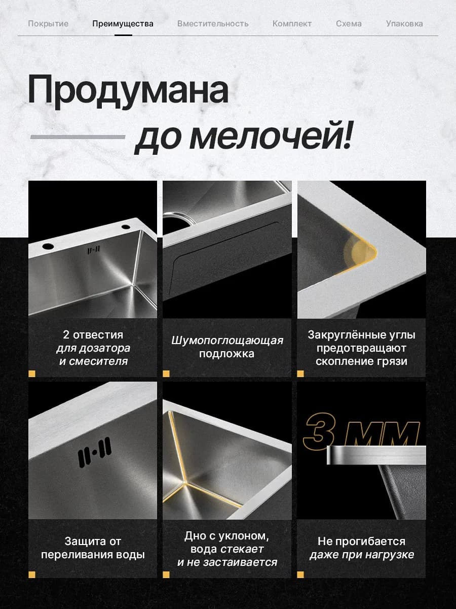 Мойка выполнена из стали, что гарантирует ее прочность и долговечность. Толщина металла чаши составляет 0.3 см, что обеспечивает надежность и устойчивость к механическим повреждениям.