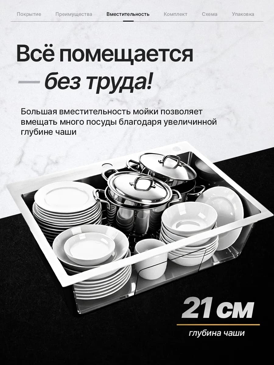Прямоугольная форма мойки и размеры 50х45 см позволяют ей гармонично вписаться в любой интерьер кухни. Глубина чаши составляет 21 см, что обеспечивает достаточное пространство для мытья посуды.