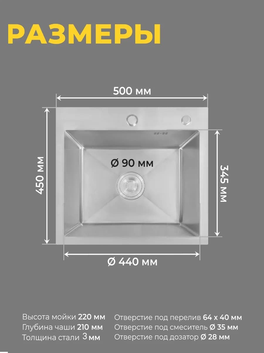 Мойка для кухни стальная KromRus 50х45 см - это высококачественный и стильный кухонный аксессуар, который станет незаменимым помощником на вашей кухне.