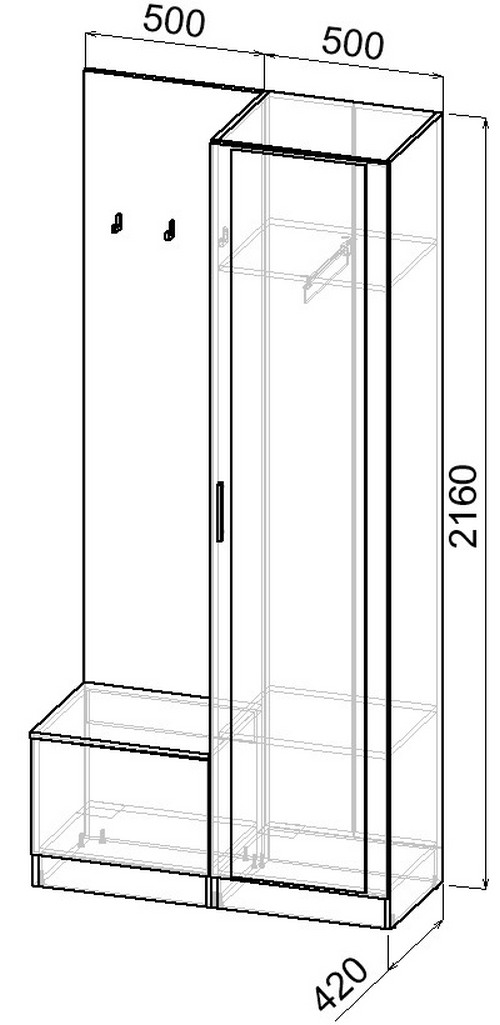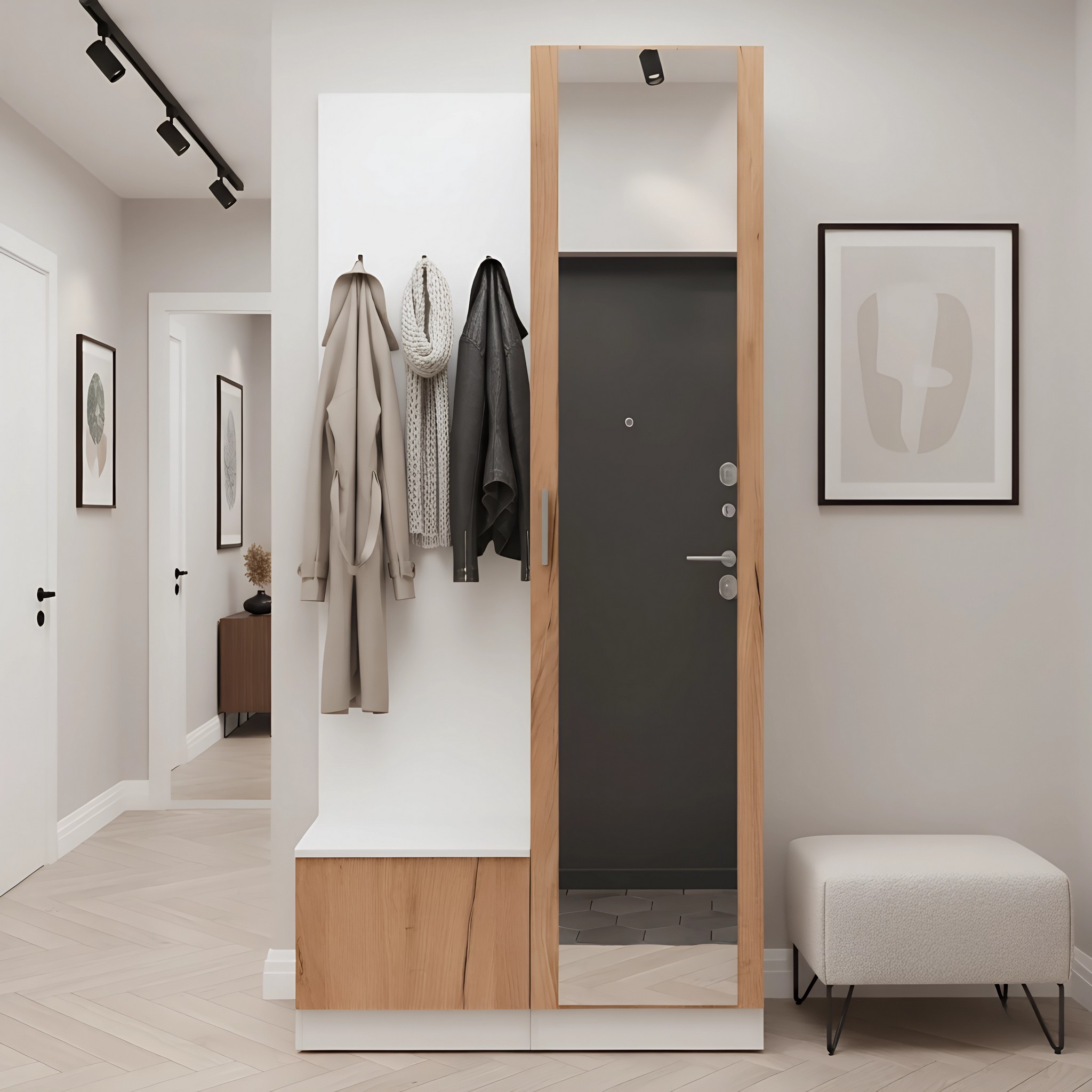 Простая и компактная прихожая вместительна и функциональна, позволит разместить все необходимые вещи: обувь, верхнюю одежду, головные уборы и различные мелкие вещи. Благодаря гармоничному сочетанию цветов прихожая создаст в вашей квартире ощущение уюта, тепла и комфорта.