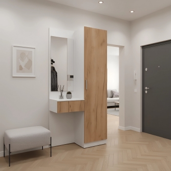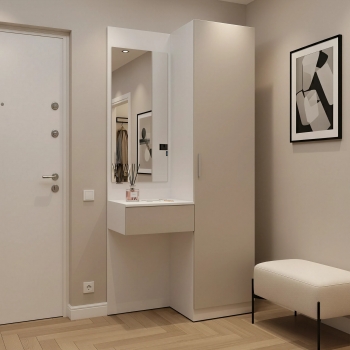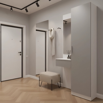 Простая и компактная прихожая вместительна и функциональна, позволит разместить все необходимые вещи: обувь, верхнюю одежду, головные уборы и различные мелкие вещи. Благодаря гармоничному сочетанию цветов прихожая создаст в вашей квартире ощущение уюта, тепла и комфорта.