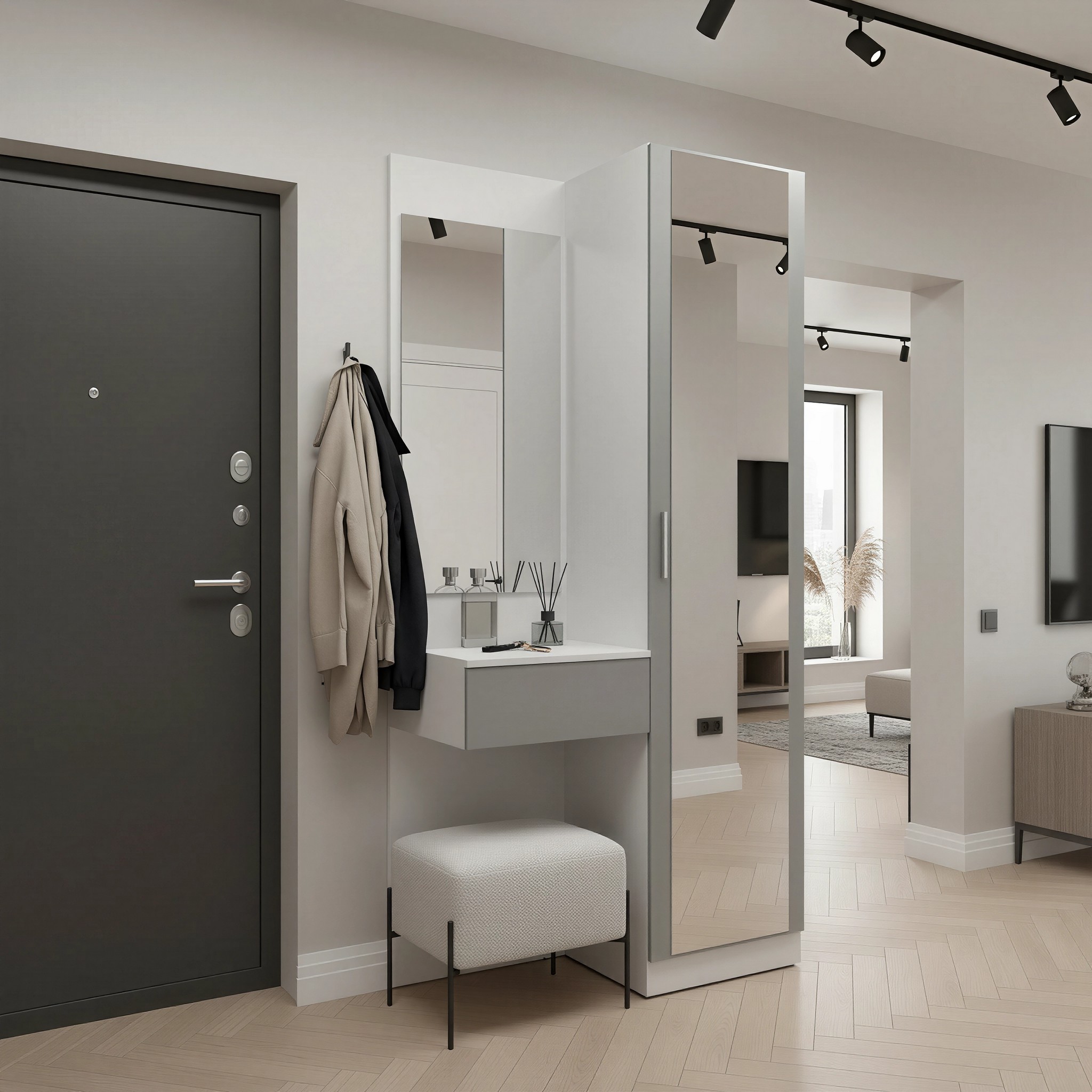 Простая и компактная прихожая вместительна и функциональна, позволит разместить все необходимые вещи: обувь, верхнюю одежду, головные уборы и различные мелкие вещи. Благодаря гармоничному сочетанию цветов прихожая создаст в вашей квартире ощущение уюта, тепла и комфорта.