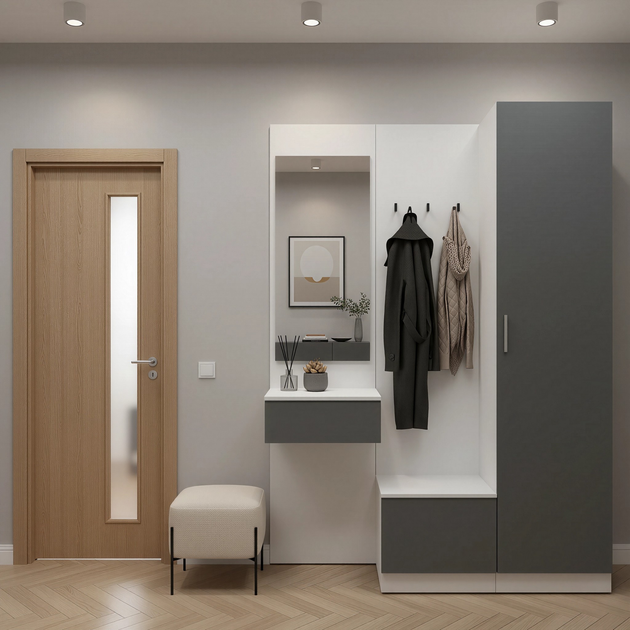 Простая и компактная прихожая вместительна и функциональна, позволит разместить все необходимые вещи: обувь, верхнюю одежду, головные уборы и различные мелкие вещи. Благодаря гармоничному сочетанию цветов прихожая создаст в вашей квартире ощущение уюта, тепла и комфорта.