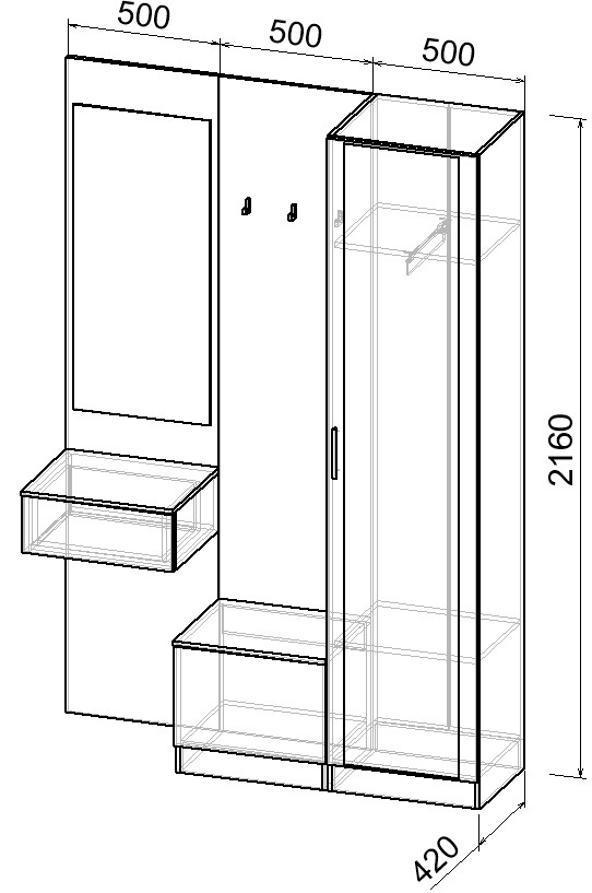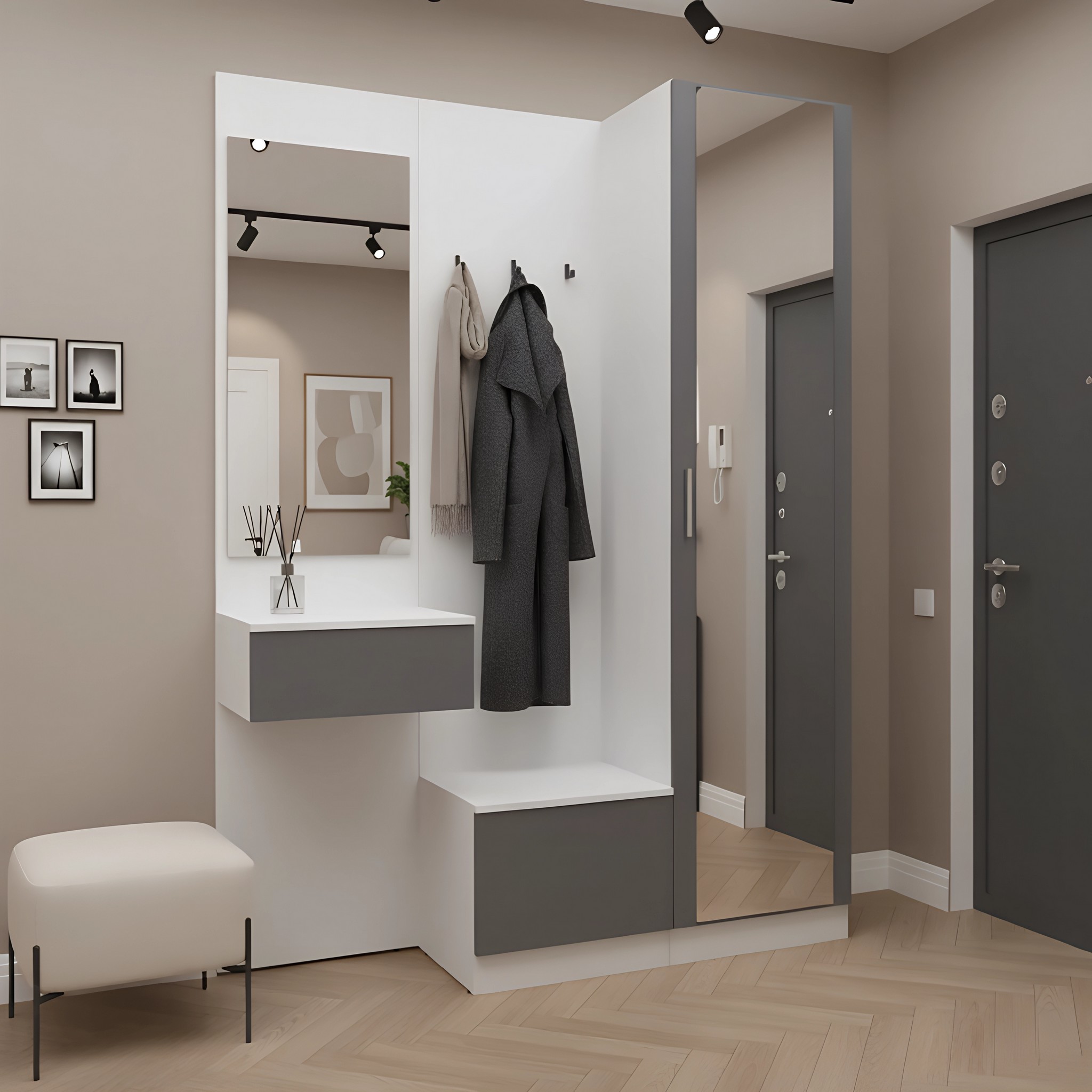 Простая и компактная прихожая вместительна и функциональна, позволит разместить все необходимые вещи: обувь, верхнюю одежду, головные уборы и различные мелкие вещи. Благодаря гармоничному сочетанию цветов прихожая создаст в вашей квартире ощущение уюта, тепла и комфорта.