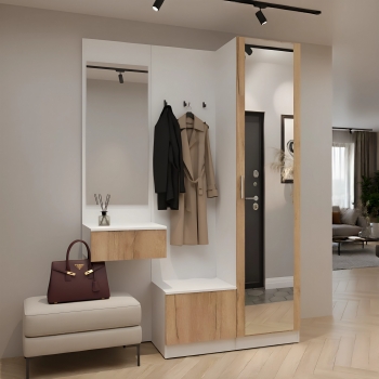 Простая и компактная прихожая вместительна и функциональна, позволит разместить все необходимые вещи: обувь, верхнюю одежду, головные уборы и различные мелкие вещи. Благодаря гармоничному сочетанию цветов прихожая создаст в вашей квартире ощущение уюта, тепла и комфорта.