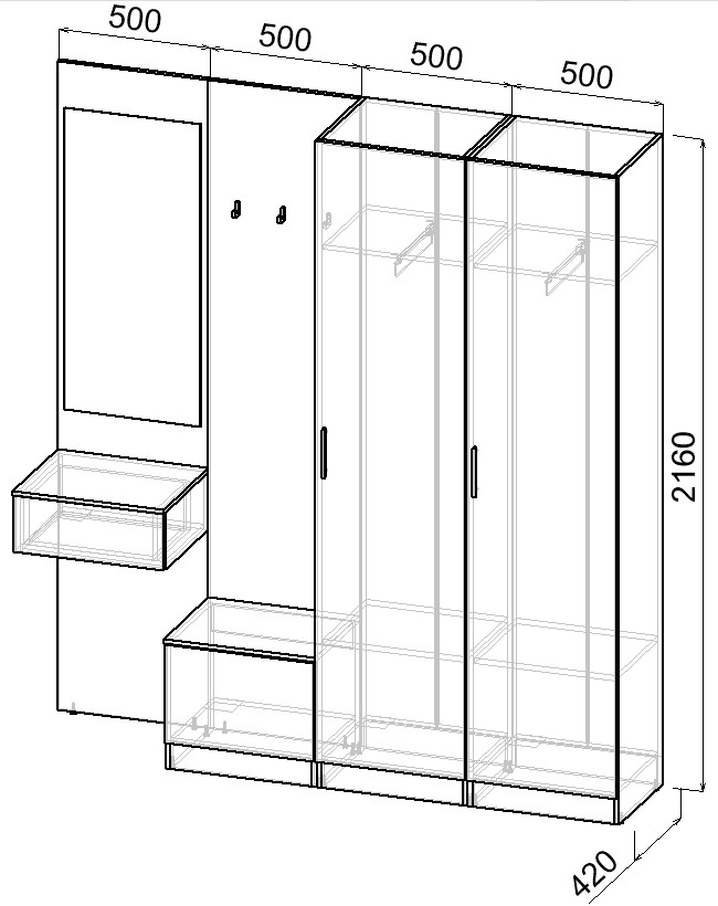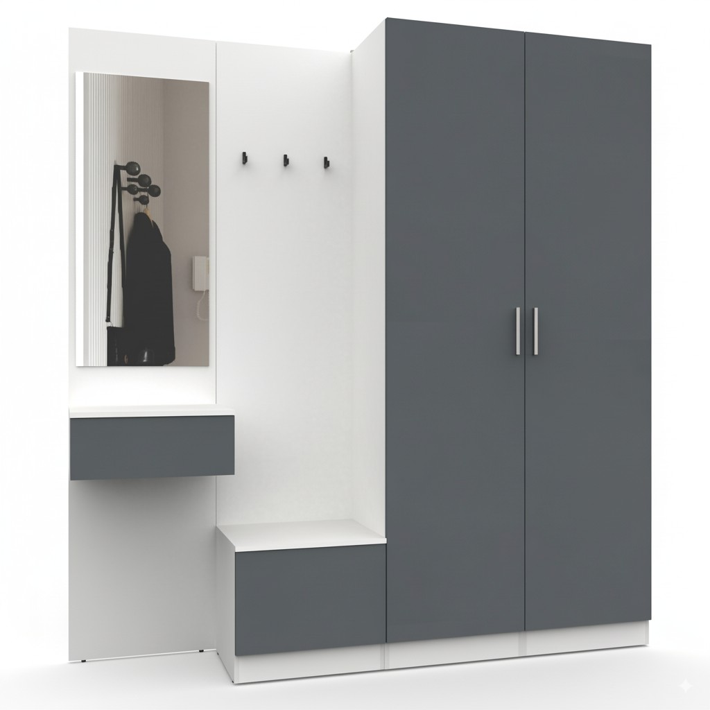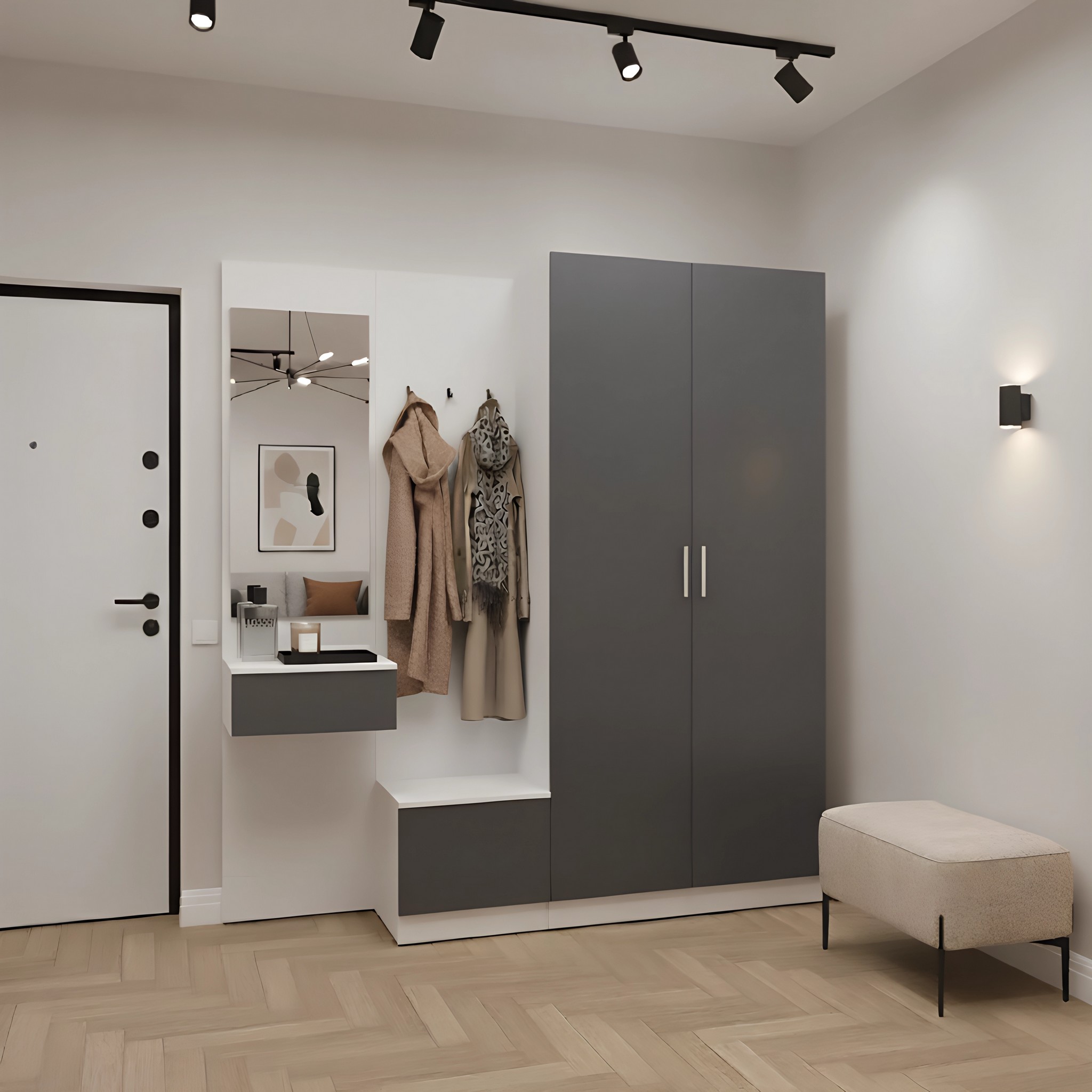 Простая и компактная прихожая вместительна и функциональна, позволит разместить все необходимые вещи: обувь, верхнюю одежду, головные уборы и различные мелкие вещи. Благодаря гармоничному сочетанию цветов прихожая создаст в вашей квартире ощущение уюта, тепла и комфорта.