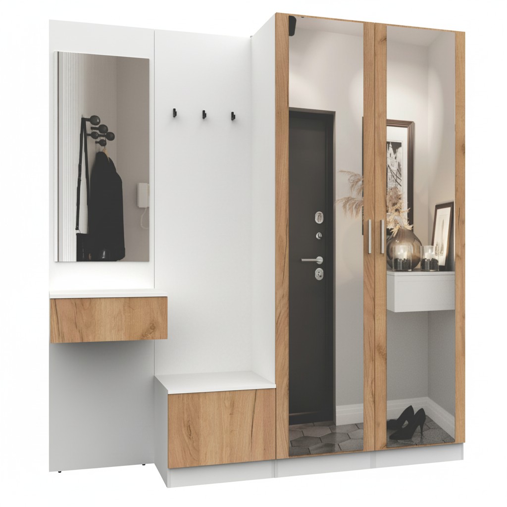 Простая и компактная прихожая вместительна и функциональна, позволит разместить все необходимые вещи: обувь, верхнюю одежду, головные уборы и различные мелкие вещи. Благодаря гармоничному сочетанию цветов прихожая создаст в вашей квартире ощущение уюта, тепла и комфорта.