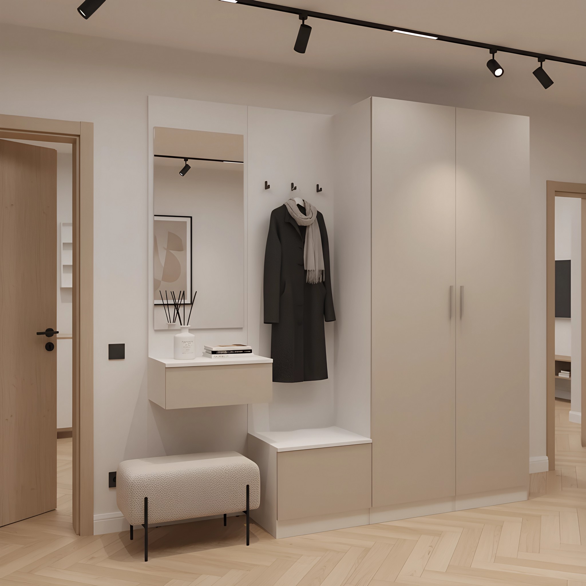 Простая и компактная прихожая вместительна и функциональна, позволит разместить все необходимые вещи: обувь, верхнюю одежду, головные уборы и различные мелкие вещи. Благодаря гармоничному сочетанию цветов прихожая создаст в вашей квартире ощущение уюта, тепла и комфорта.