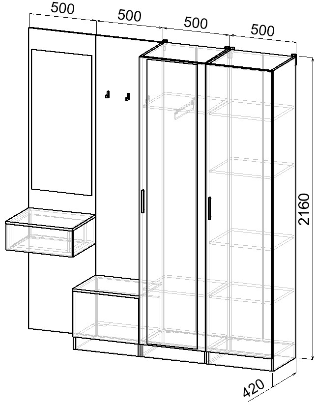 Простая и компактная прихожая вместительна и функциональна, позволит разместить все необходимые вещи: обувь, верхнюю одежду, головные уборы и различные мелкие вещи. Благодаря гармоничному сочетанию цветов прихожая создаст в вашей квартире ощущение уюта, тепла и комфорта.
