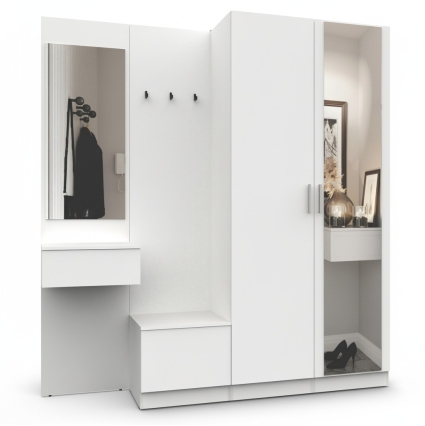 Простая и компактная прихожая вместительна и функциональна, позволит разместить все необходимые вещи: обувь, верхнюю одежду, головные уборы и различные мелкие вещи. Благодаря гармоничному сочетанию цветов прихожая создаст в вашей квартире ощущение уюта, тепла и комфорта.