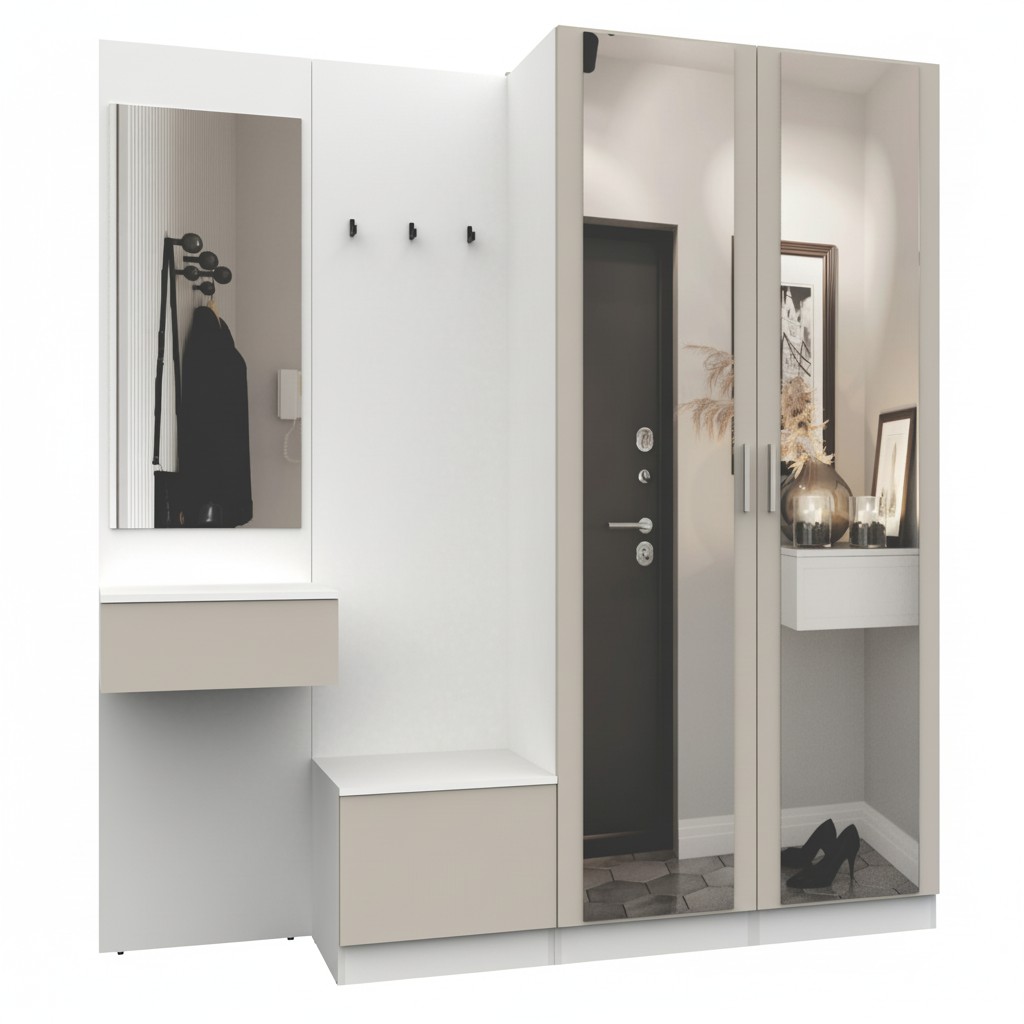 Простая и компактная прихожая вместительна и функциональна, позволит разместить все необходимые вещи: обувь, верхнюю одежду, головные уборы и различные мелкие вещи. Благодаря гармоничному сочетанию цветов прихожая создаст в вашей квартире ощущение уюта, тепла и комфорта.
