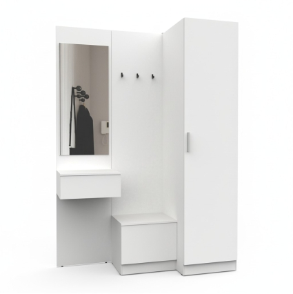 Простая и компактная прихожая вместительна и функциональна, позволит разместить все необходимые вещи: обувь, верхнюю одежду, головные уборы и различные мелкие вещи. Благодаря гармоничному сочетанию цветов прихожая создаст в вашей квартире ощущение уюта, тепла и комфорта.
