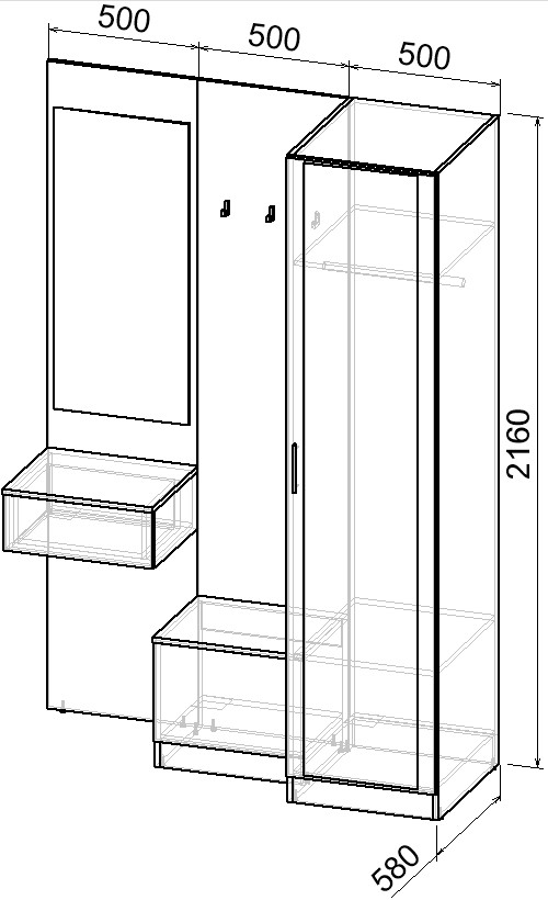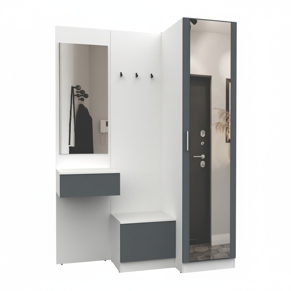 Простая и компактная прихожая вместительна и функциональна, позволит разместить все необходимые вещи: обувь, верхнюю одежду, головные уборы и различные мелкие вещи. Благодаря гармоничному сочетанию цветов прихожая создаст в вашей квартире ощущение уюта, тепла и комфорта.