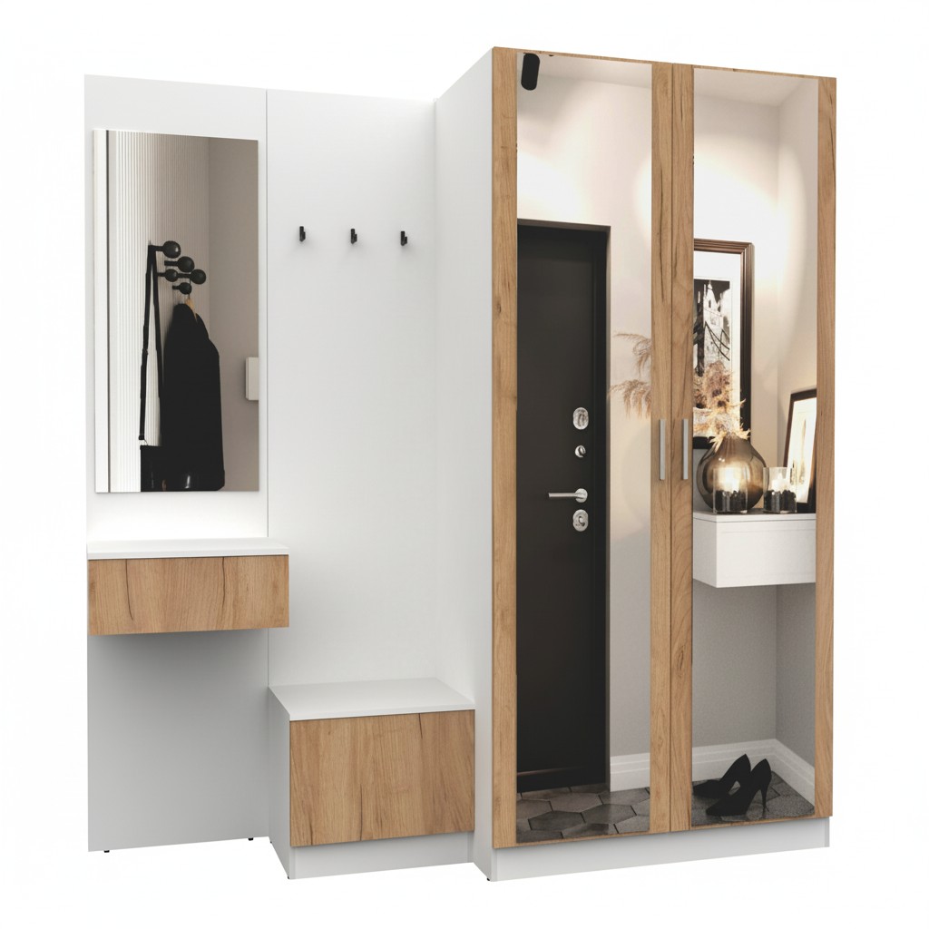 Простая и компактная прихожая вместительна и функциональна, позволит разместить все необходимые вещи: обувь, верхнюю одежду, головные уборы и различные мелкие вещи. Благодаря гармоничному сочетанию цветов прихожая создаст в вашей квартире ощущение уюта, тепла и комфорта.