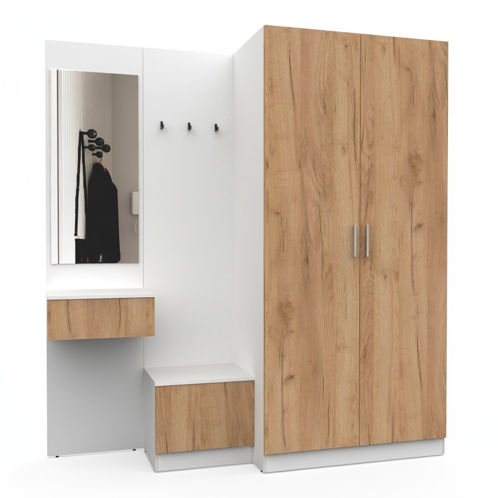 Простая и компактная прихожая вместительна и функциональна, позволит разместить все необходимые вещи: обувь, верхнюю одежду, головные уборы и различные мелкие вещи. Благодаря гармоничному сочетанию цветов прихожая создаст в вашей квартире ощущение уюта, тепла и комфорта.