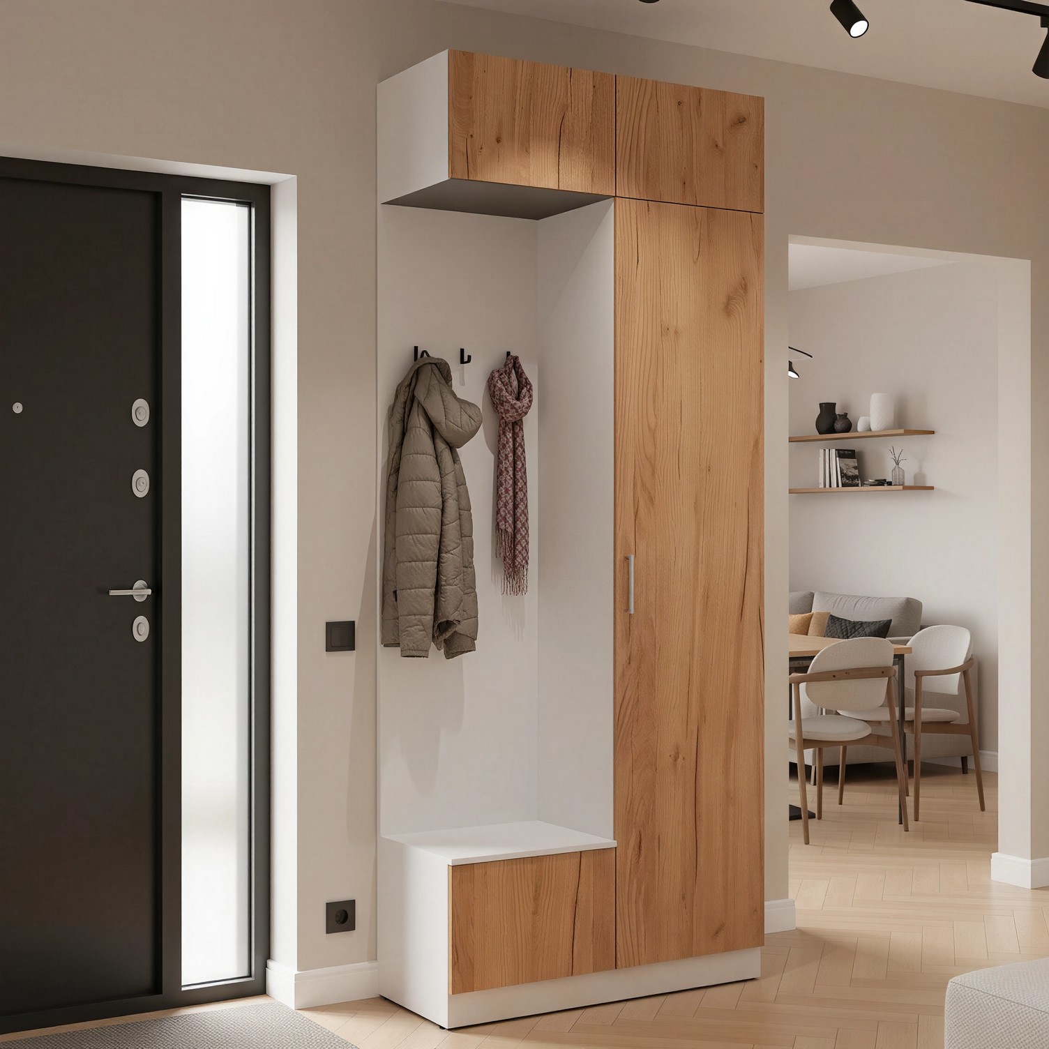 Простая и компактная прихожая вместительна и функциональна, позволит разместить все необходимые вещи: обувь, верхнюю одежду, головные уборы и различные мелкие вещи. Благодаря гармоничному сочетанию цветов прихожая создаст в вашей квартире ощущение уюта, тепла и комфорта.