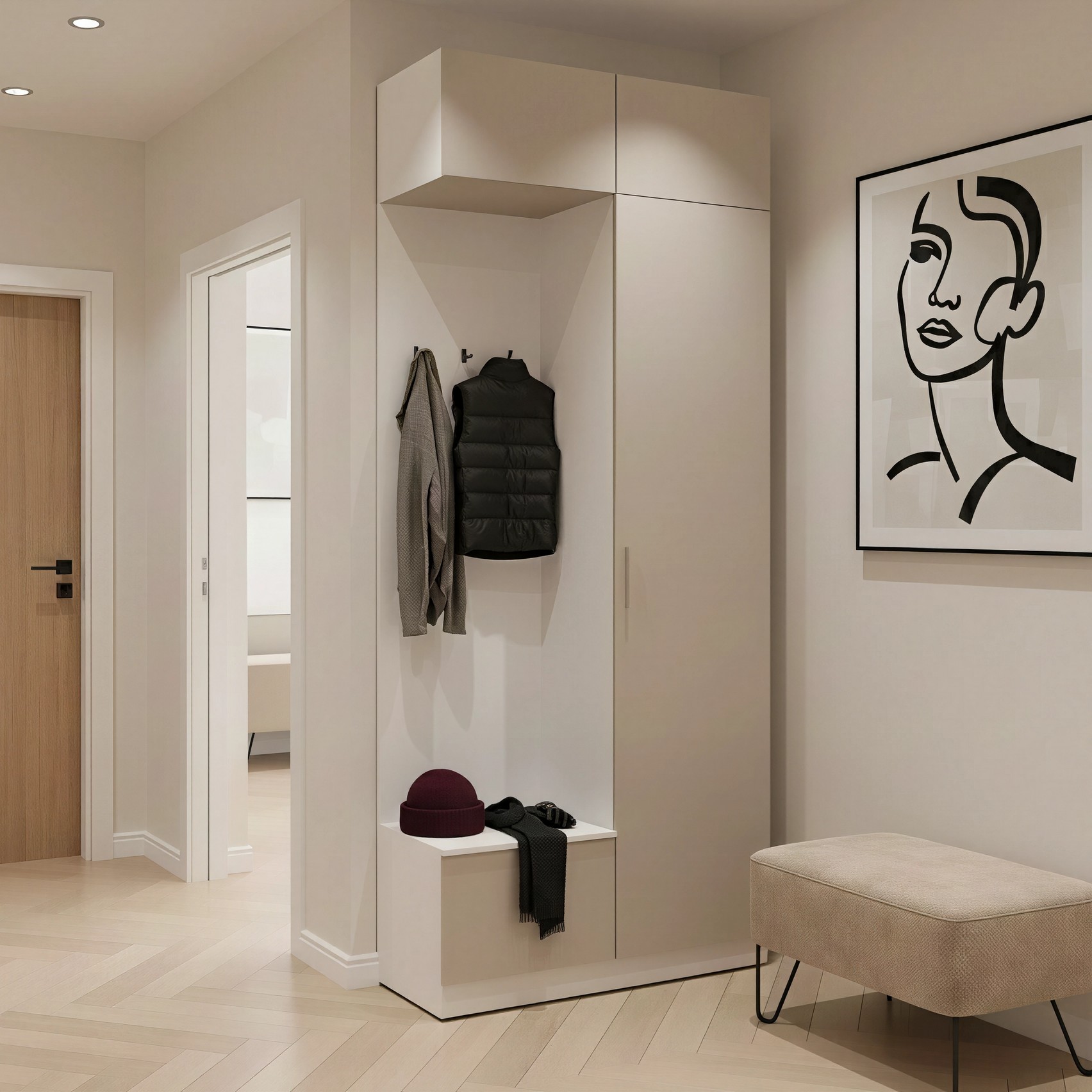 Простая и компактная прихожая вместительна и функциональна, позволит разместить все необходимые вещи: обувь, верхнюю одежду, головные уборы и различные мелкие вещи. Благодаря гармоничному сочетанию цветов прихожая создаст в вашей квартире ощущение уюта, тепла и комфорта.