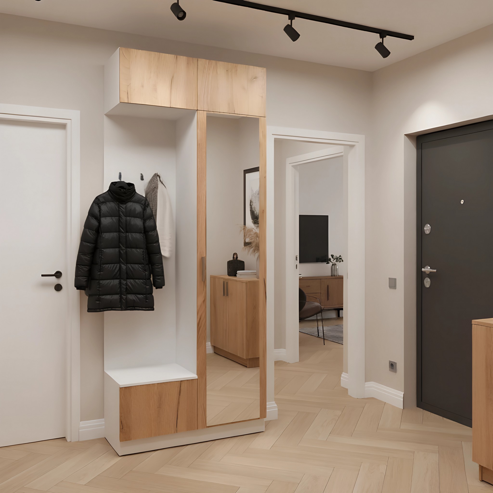 Простая и компактная прихожая вместительна и функциональна, позволит разместить все необходимые вещи: обувь, верхнюю одежду, головные уборы и различные мелкие вещи. Благодаря гармоничному сочетанию цветов прихожая создаст в вашей квартире ощущение уюта, тепла и комфорта.