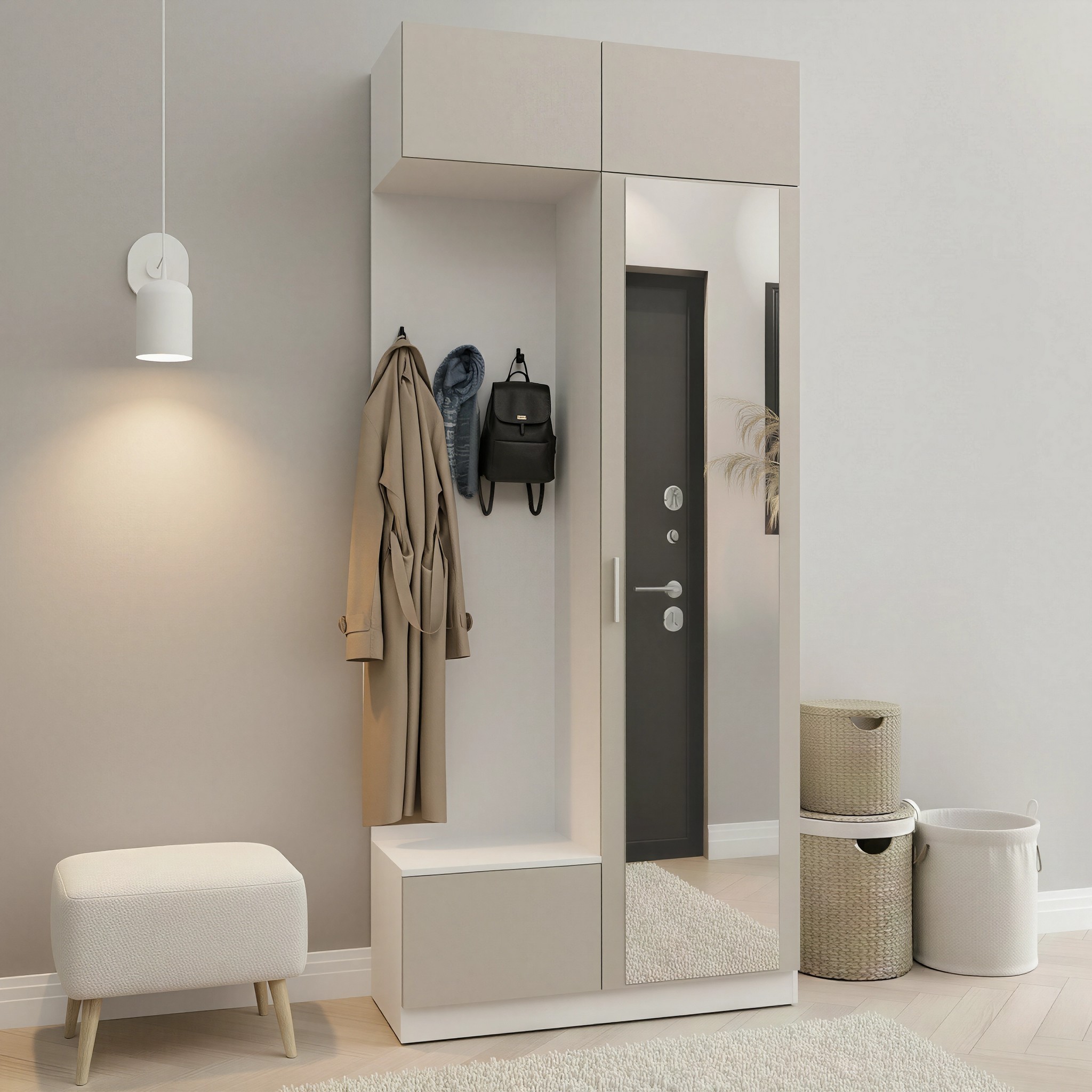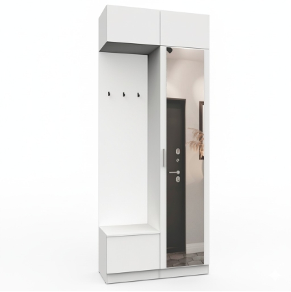 Простая и компактная прихожая вместительна и функциональна, позволит разместить все необходимые вещи: обувь, верхнюю одежду, головные уборы и различные мелкие вещи. Благодаря гармоничному сочетанию цветов прихожая создаст в вашей квартире ощущение уюта, тепла и комфорта.