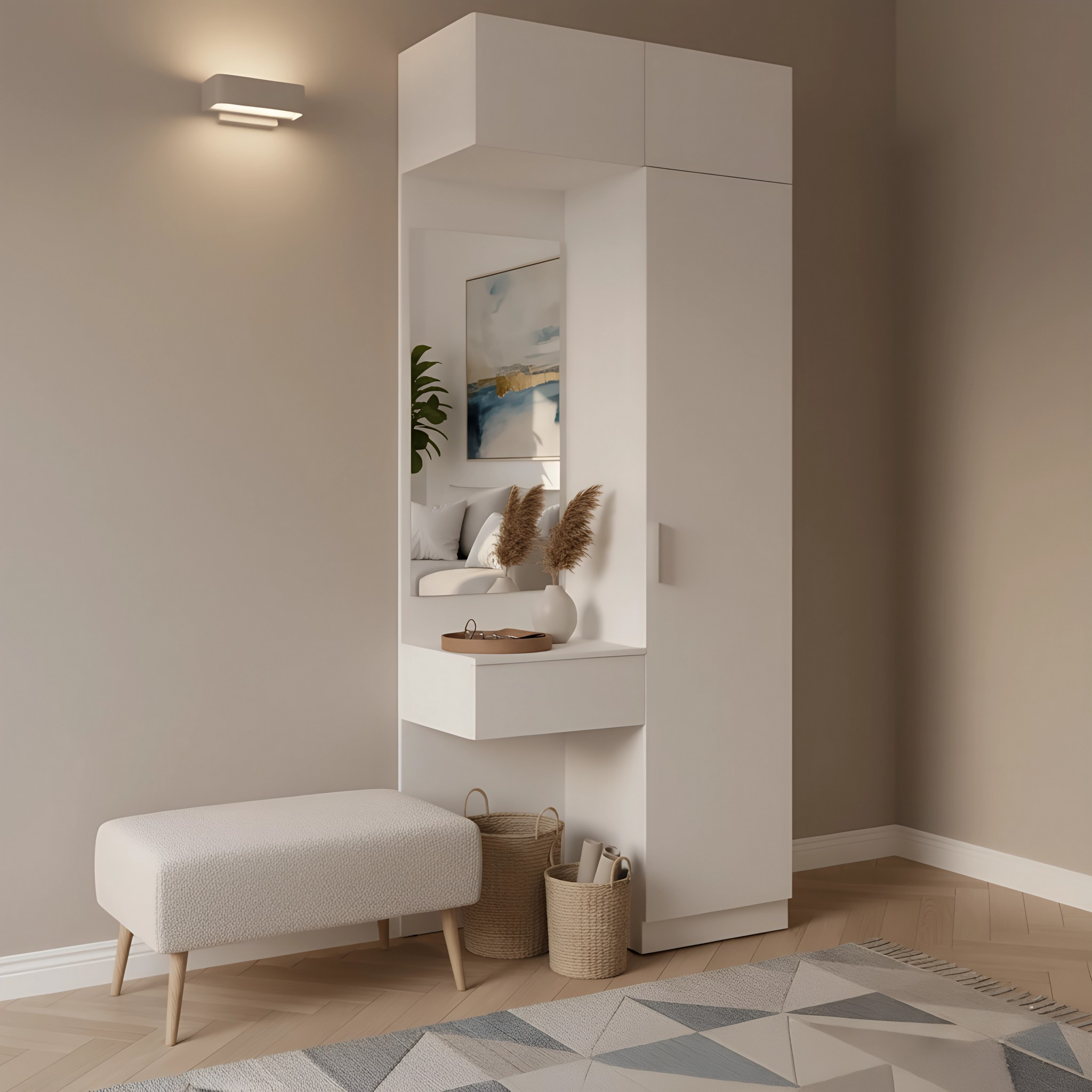 Простая и компактная прихожая вместительна и функциональна, позволит разместить все необходимые вещи: обувь, верхнюю одежду, головные уборы и различные мелкие вещи. Благодаря гармоничному сочетанию цветов прихожая создаст в вашей квартире ощущение уюта, тепла и комфорта.