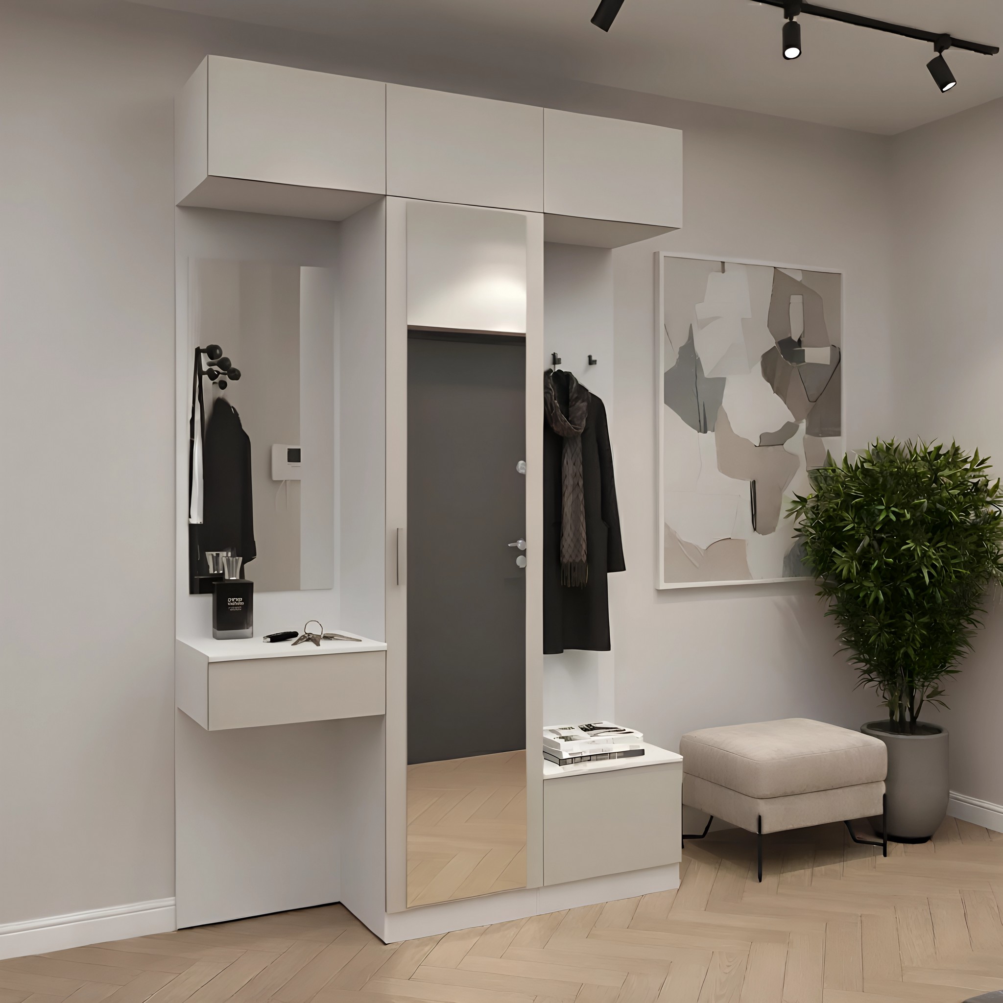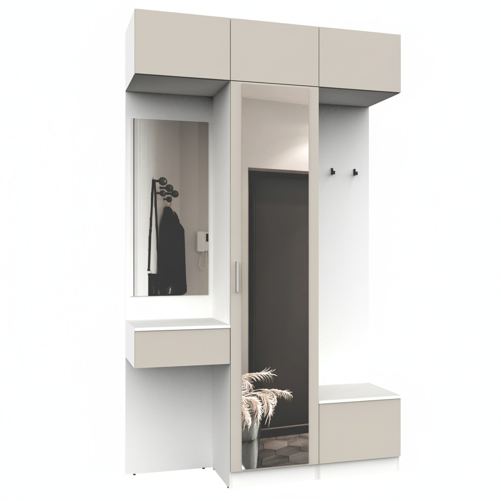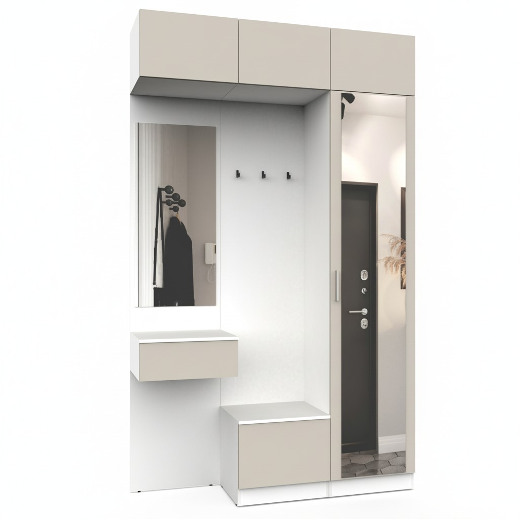 Простая и компактная прихожая вместительна и функциональна, позволит разместить все необходимые вещи: обувь, верхнюю одежду, головные уборы и различные мелкие вещи. Благодаря гармоничному сочетанию цветов прихожая создаст в вашей квартире ощущение уюта, тепла и комфорта.