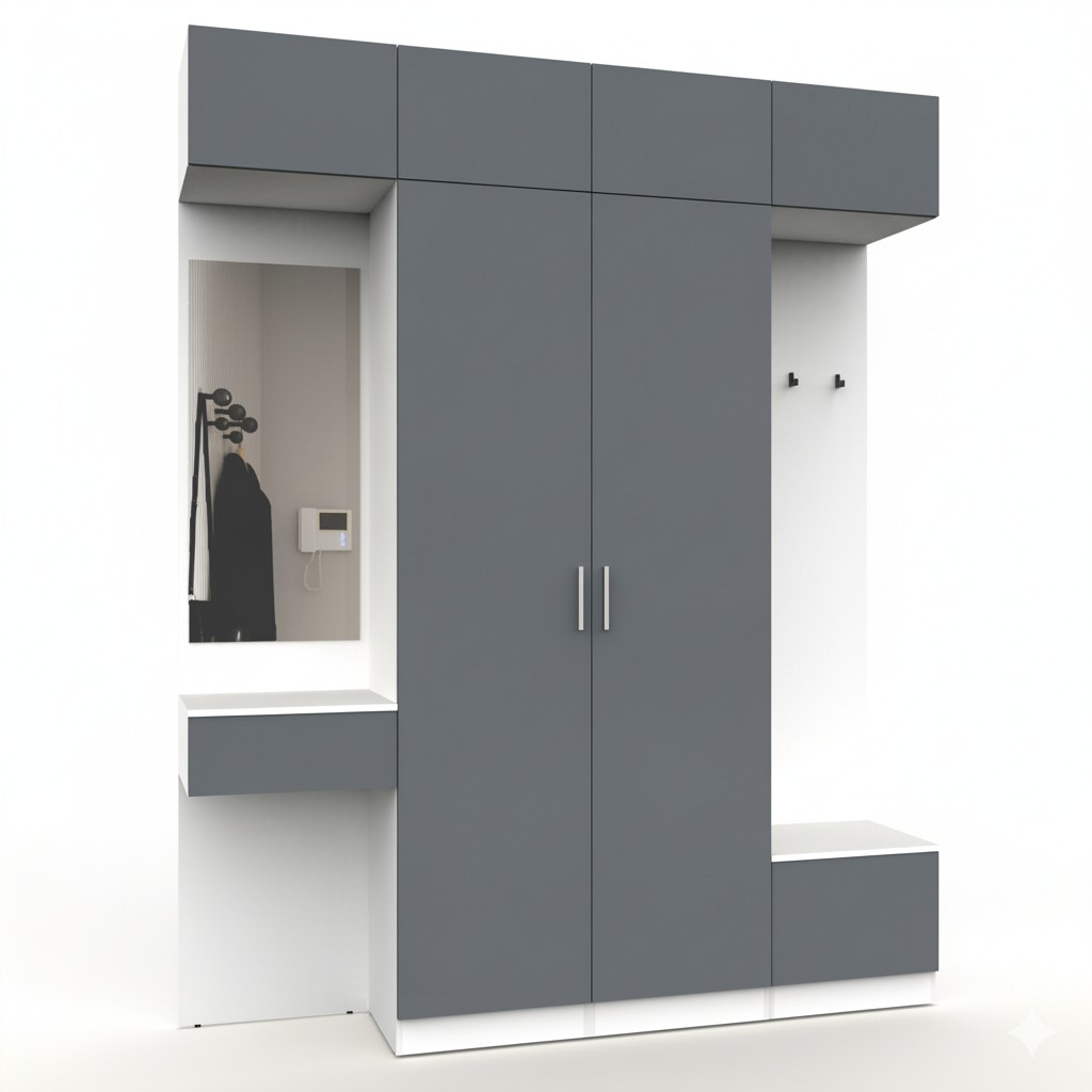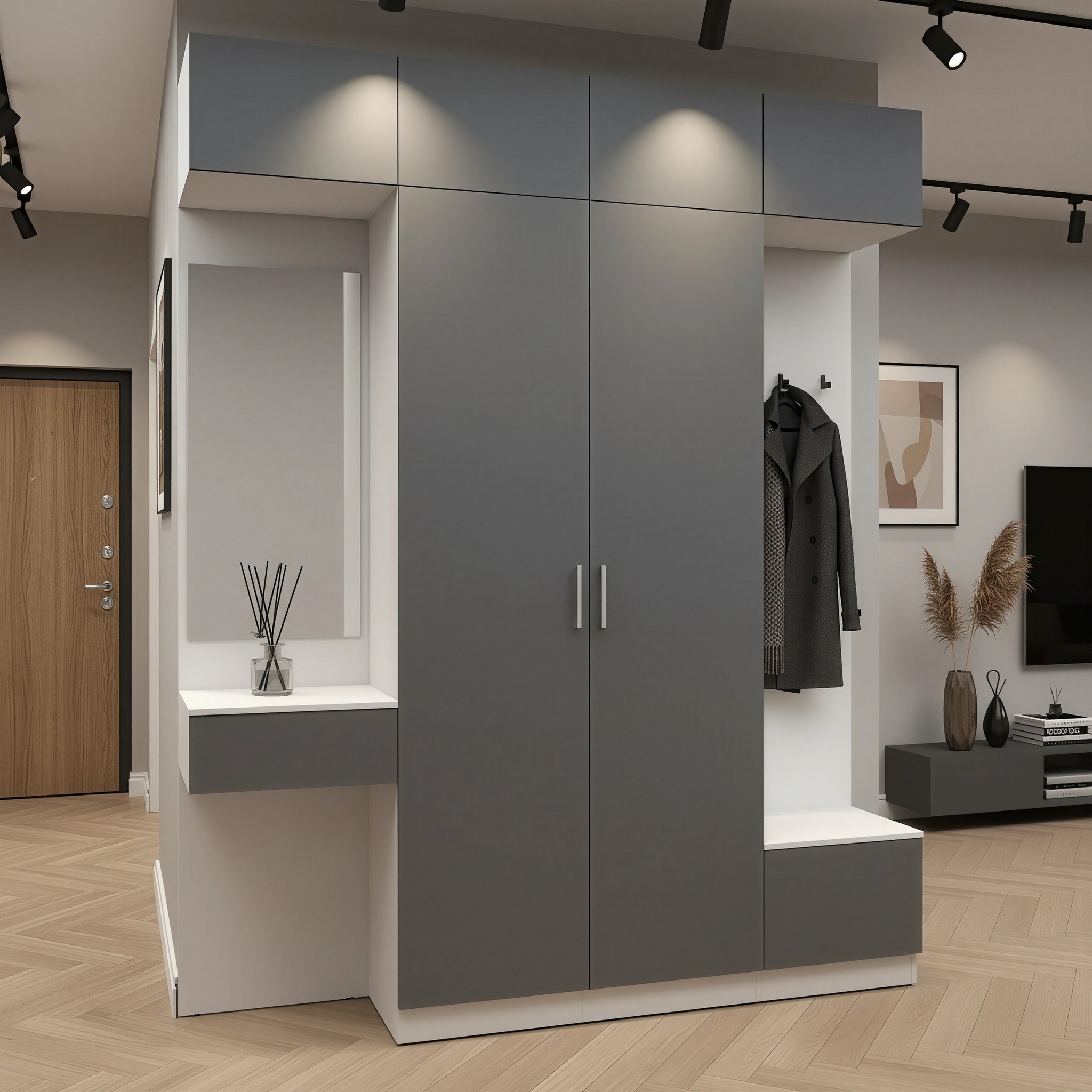 Простая и компактная прихожая вместительна и функциональна, позволит разместить все необходимые вещи: обувь, верхнюю одежду, головные уборы и различные мелкие вещи. Благодаря гармоничному сочетанию цветов прихожая создаст в вашей квартире ощущение уюта, тепла и комфорта.