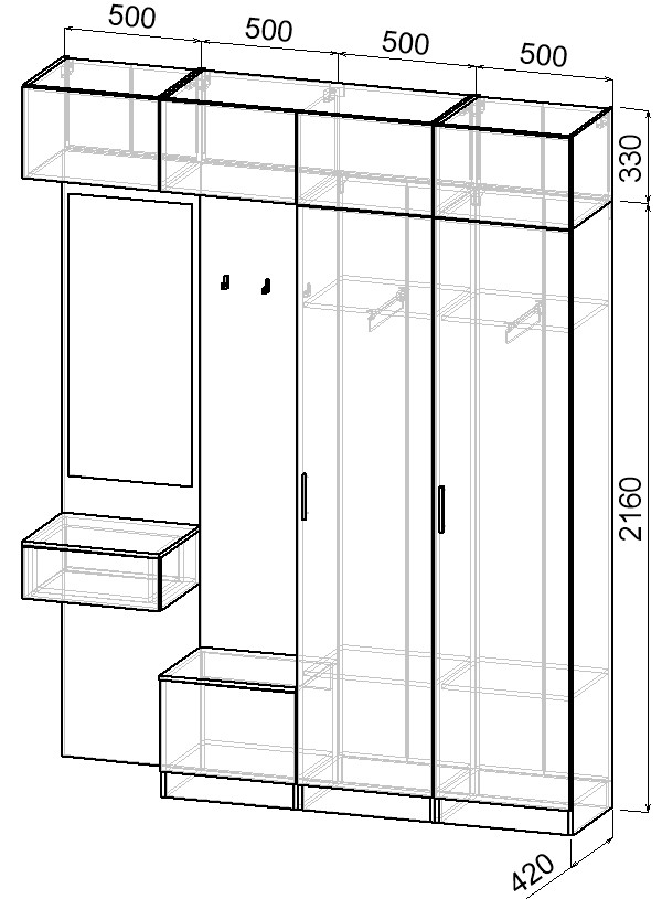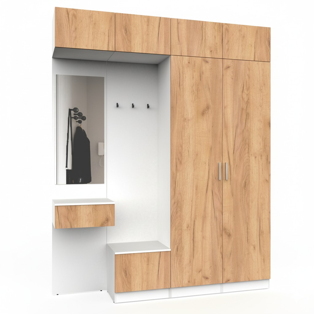 Простая и компактная прихожая вместительна и функциональна, позволит разместить все необходимые вещи: обувь, верхнюю одежду, головные уборы и различные мелкие вещи. Благодаря гармоничному сочетанию цветов прихожая создаст в вашей квартире ощущение уюта, тепла и комфорта.