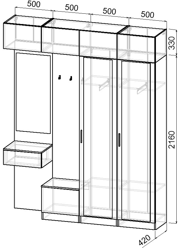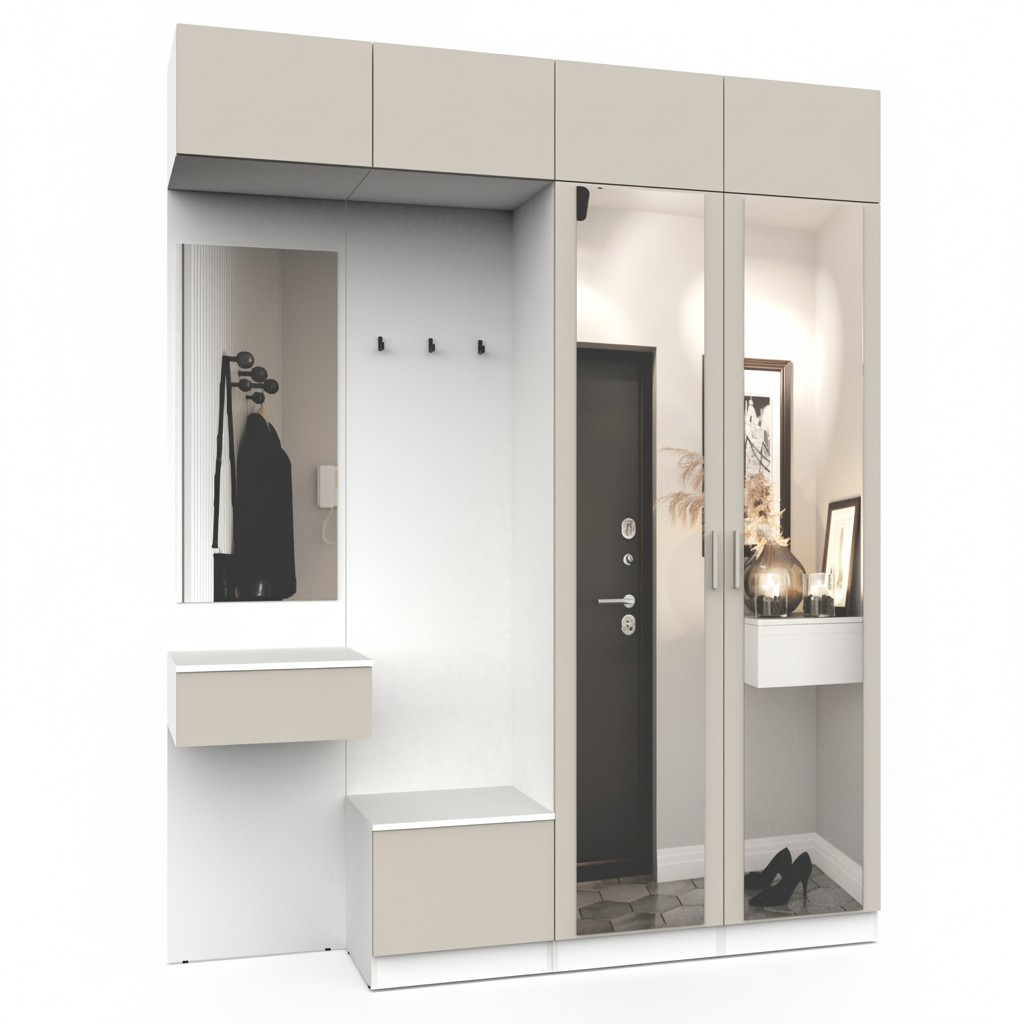 Простая и компактная прихожая вместительна и функциональна, позволит разместить все необходимые вещи: обувь, верхнюю одежду, головные уборы и различные мелкие вещи. Благодаря гармоничному сочетанию цветов прихожая создаст в вашей квартире ощущение уюта, тепла и комфорта.