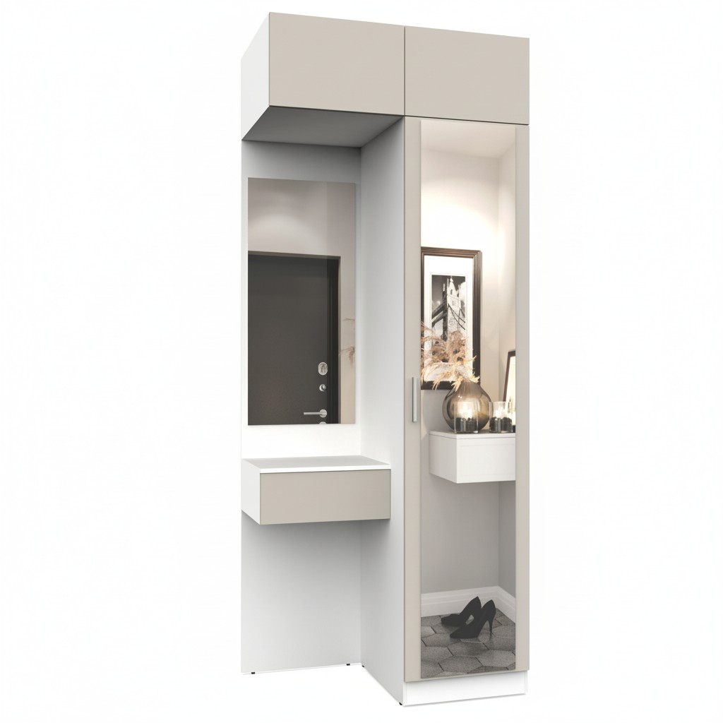 Простая и компактная прихожая вместительна и функциональна, позволит разместить все необходимые вещи: обувь, верхнюю одежду, головные уборы и различные мелкие вещи. Благодаря гармоничному сочетанию цветов прихожая создаст в вашей квартире ощущение уюта, тепла и комфорта.