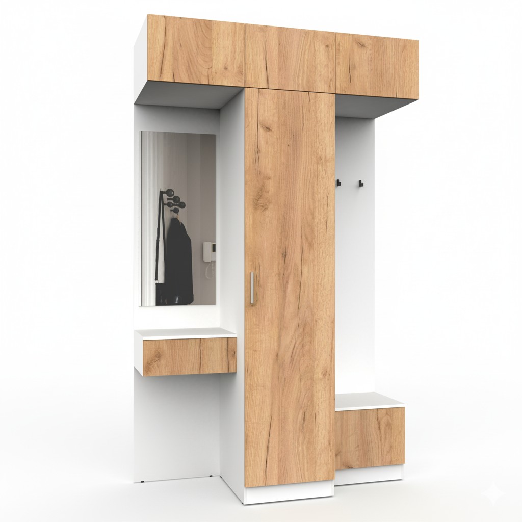 Простая и компактная прихожая вместительна и функциональна, позволит разместить все необходимые вещи: обувь, верхнюю одежду, головные уборы и различные мелкие вещи. Благодаря гармоничному сочетанию цветов прихожая создаст в вашей квартире ощущение уюта, тепла и комфорта.