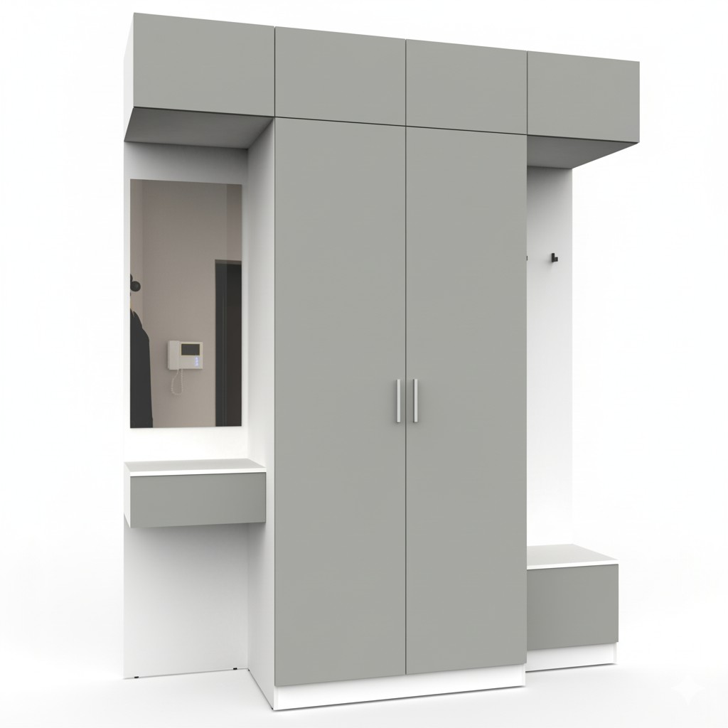 Простая и компактная прихожая вместительна и функциональна, позволит разместить все необходимые вещи: обувь, верхнюю одежду, головные уборы и различные мелкие вещи. Благодаря гармоничному сочетанию цветов прихожая создаст в вашей квартире ощущение уюта, тепла и комфорта.