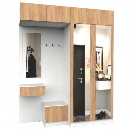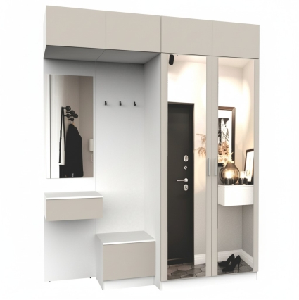 Простая и компактная прихожая вместительна и функциональна, позволит разместить все необходимые вещи: обувь, верхнюю одежду, головные уборы и различные мелкие вещи. Благодаря гармоничному сочетанию цветов прихожая создаст в вашей квартире ощущение уюта, тепла и комфорта.