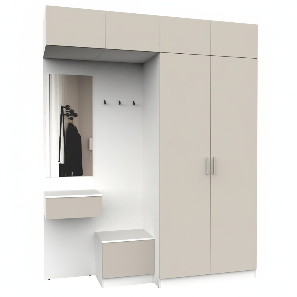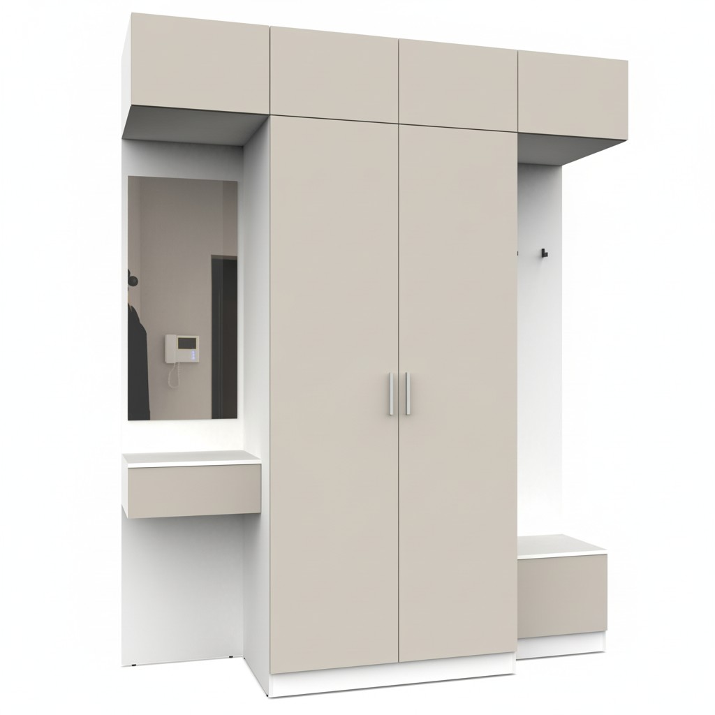 Простая и компактная прихожая вместительна и функциональна, позволит разместить все необходимые вещи: обувь, верхнюю одежду, головные уборы и различные мелкие вещи. Благодаря гармоничному сочетанию цветов прихожая создаст в вашей квартире ощущение уюта, тепла и комфорта.