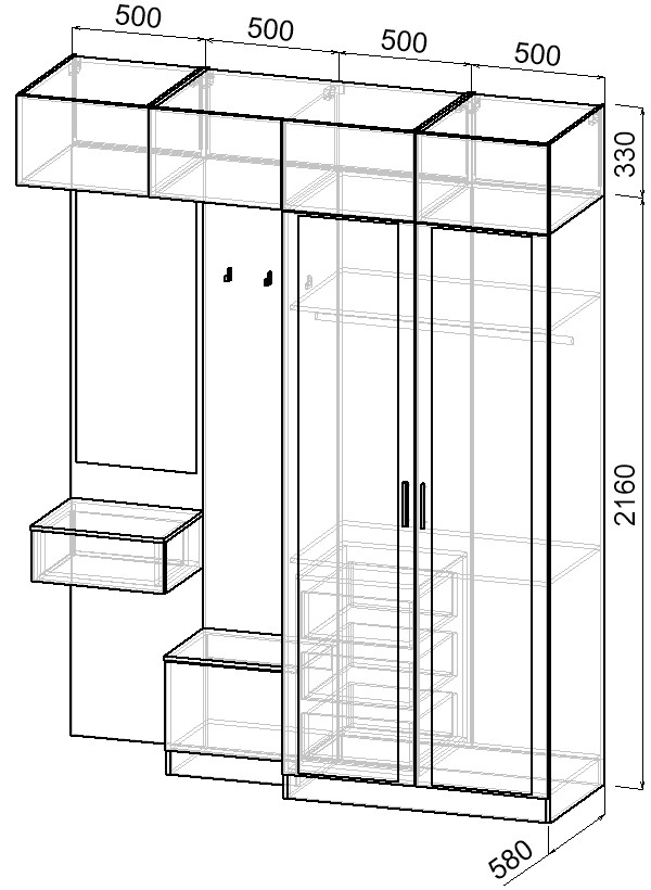 Простая и компактная прихожая вместительна и функциональна, позволит разместить все необходимые вещи: обувь, верхнюю одежду, головные уборы и различные мелкие вещи. Благодаря гармоничному сочетанию цветов прихожая создаст в вашей квартире ощущение уюта, тепла и комфорта.