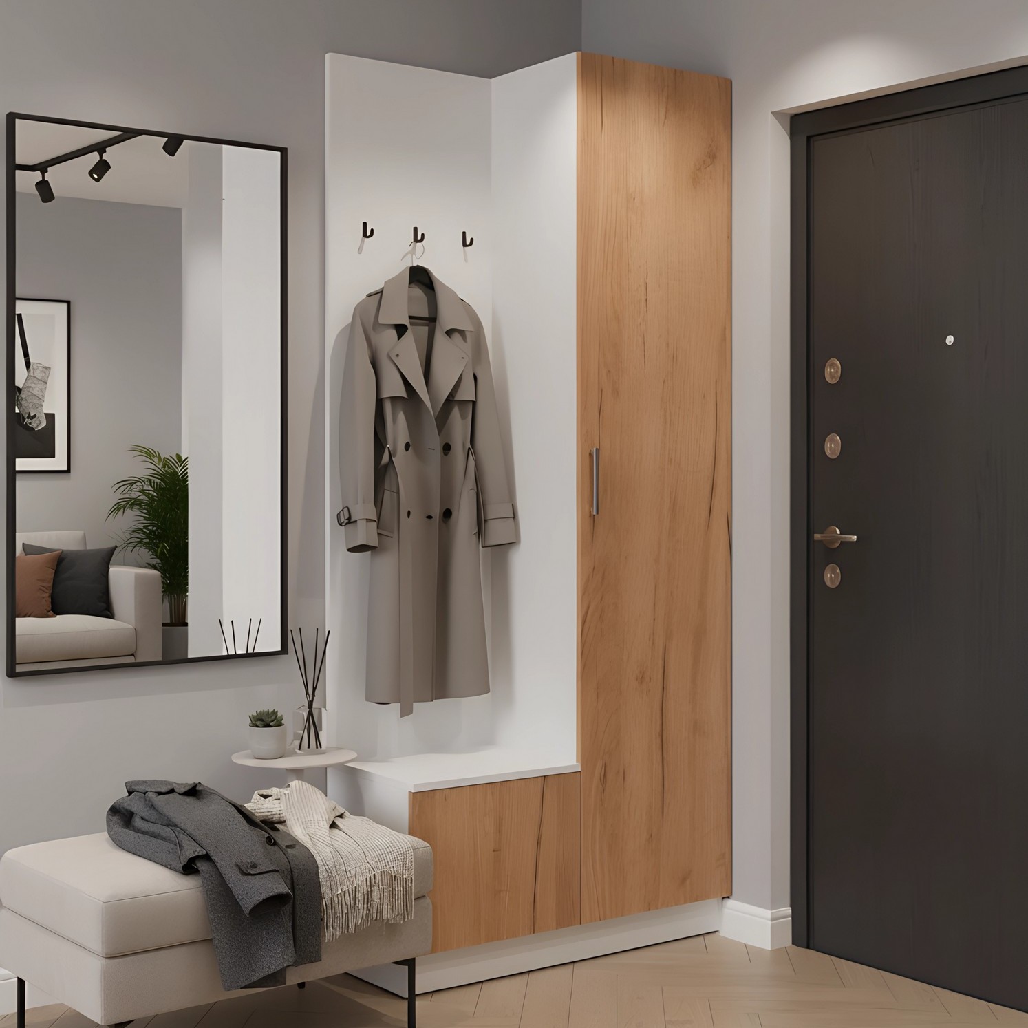 Простая и компактная прихожая вместительна и функциональна, позволит разместить все необходимые вещи: обувь, верхнюю одежду, головные уборы и различные мелкие вещи. Благодаря гармоничному сочетанию цветов прихожая создаст в вашей квартире ощущение уюта, тепла и комфорта.