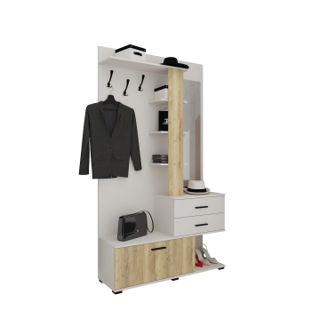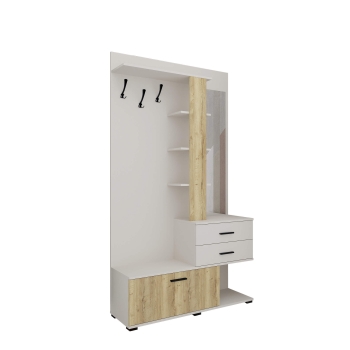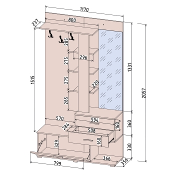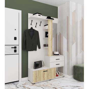 Вита-1 Компактная прихожая с двумя шуфлядами полного выдвижения, зеркалом, тумбой для хранения обуви, открытой антресолью и зоной с крючками для одежды. (Ширина: 1170мм Глубина: 356мм Высота: 2057мм)
