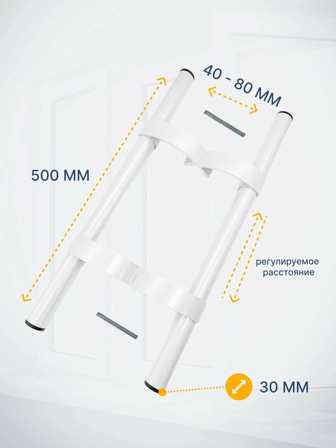 Расстояние между креплениями (межосевое расстояние) ПЕРЕМЕННОЕ и регулируется при помощи смещения крепежных кронштейнов по всей длине ручки.