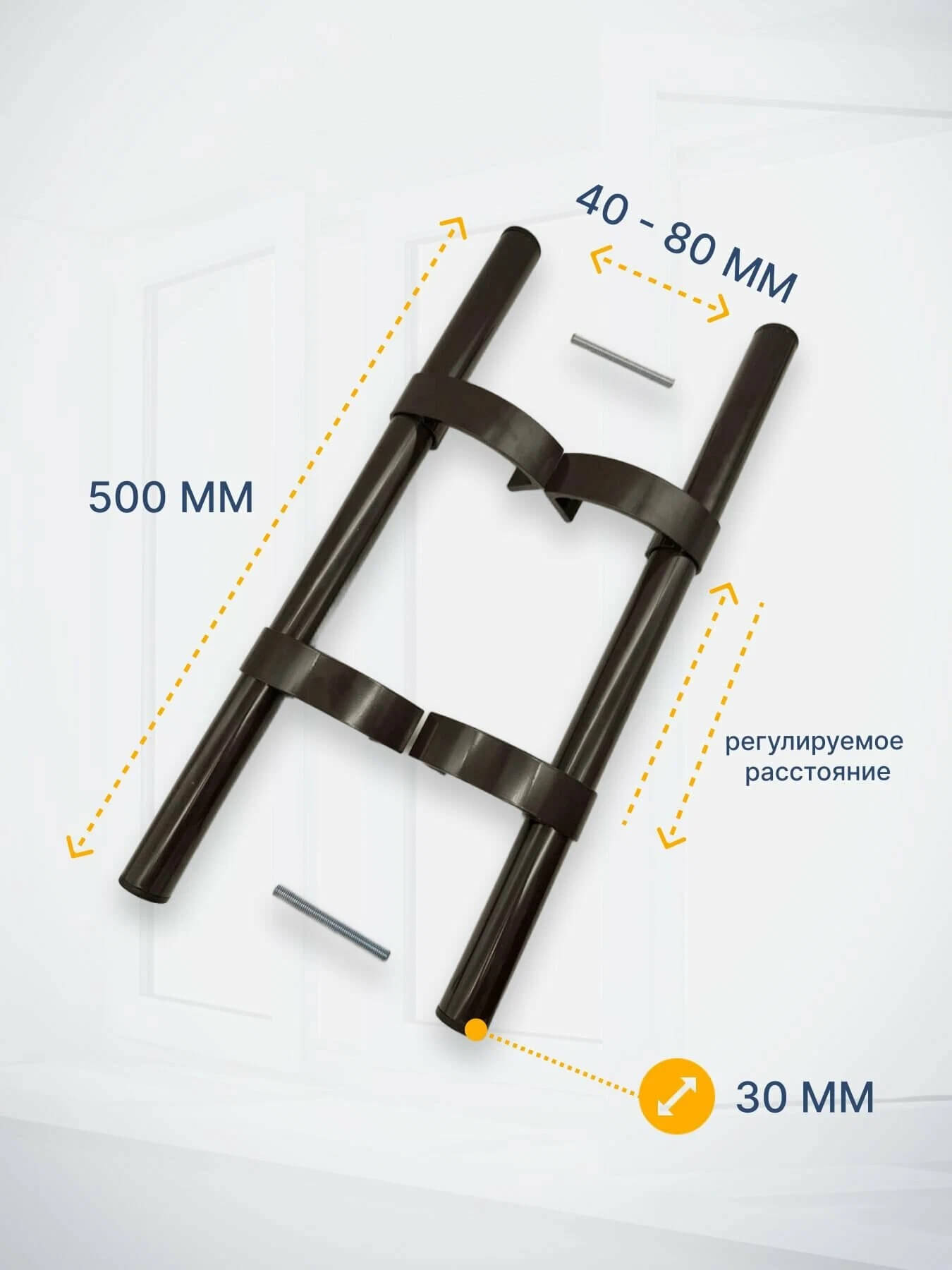 Расстояние между креплениями (межосевое расстояние) ПЕРЕМЕННОЕ и регулируется при помощи смещения крепежных кронштейнов по всей длине ручки.