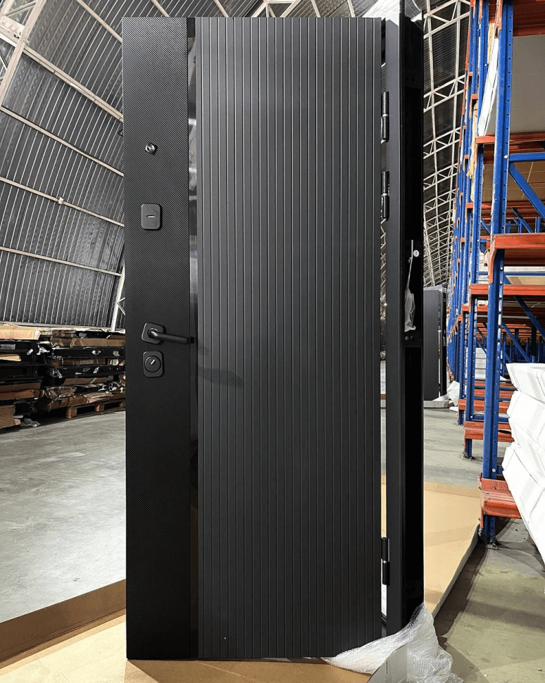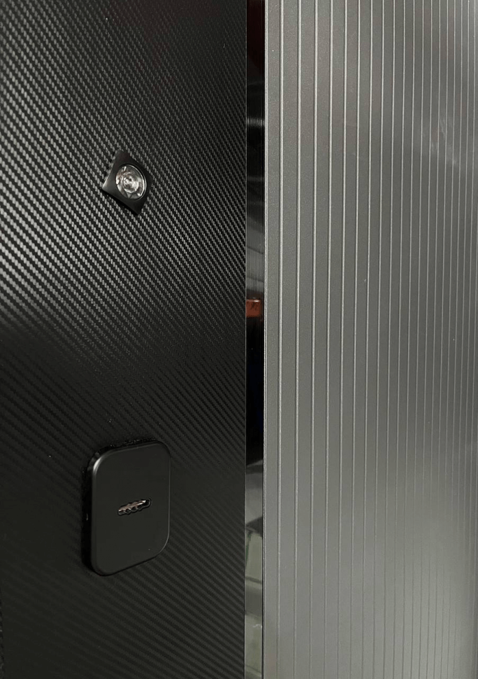 Внешняя отделка из МДФ панели «Сатин карбон» создаёт на двери эффектную матовую поверхность с благородным графитовым отливом.