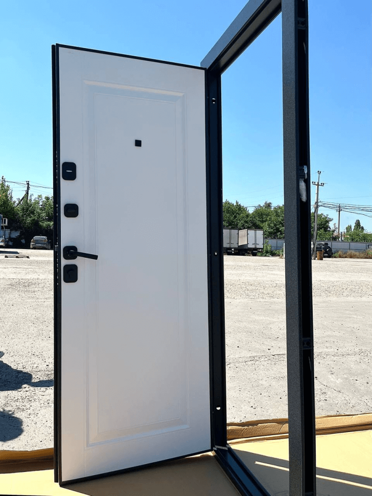 Классическая белая внутренняя панель с изящной фрезеровкой дополнена лаконичной черной фурнитурой, обеспечивая элегантный вид изнутри.