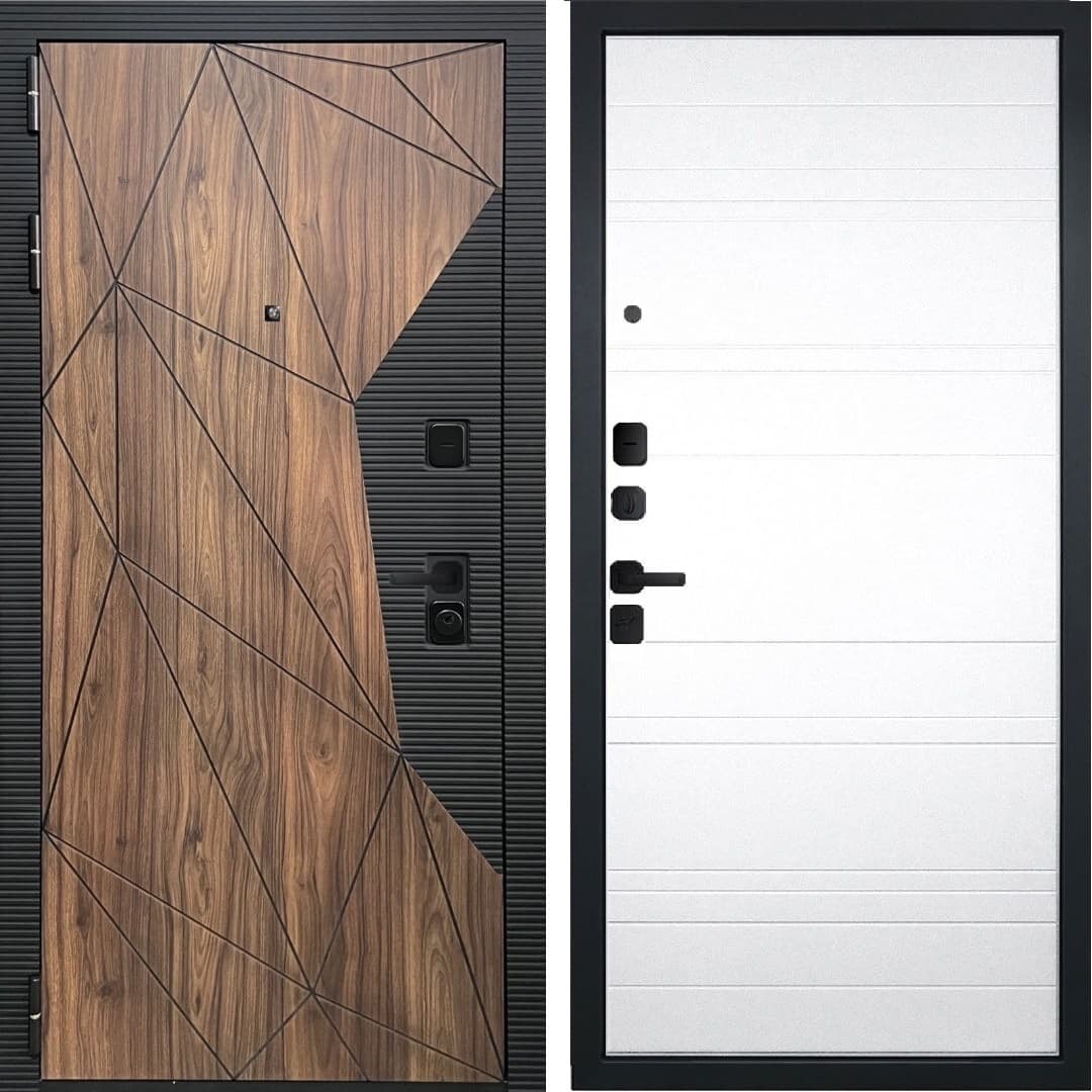 Снаружи дверь имеет красивую внешнюю декоративную панель, которую эстетично дополняют МДФ-наличники в тон панели. Декоративная накладка с логотипом двери, как защита от подделок, расположена на торце дверного полотна.