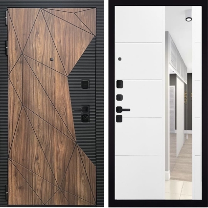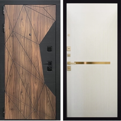 Снаружи дверь имеет красивую внешнюю декоративную панель, которую эстетично дополняют МДФ-наличники в тон панели. Декоративная накладка с логотипом двери, как защита от подделок, расположена на торце дверного полотна.