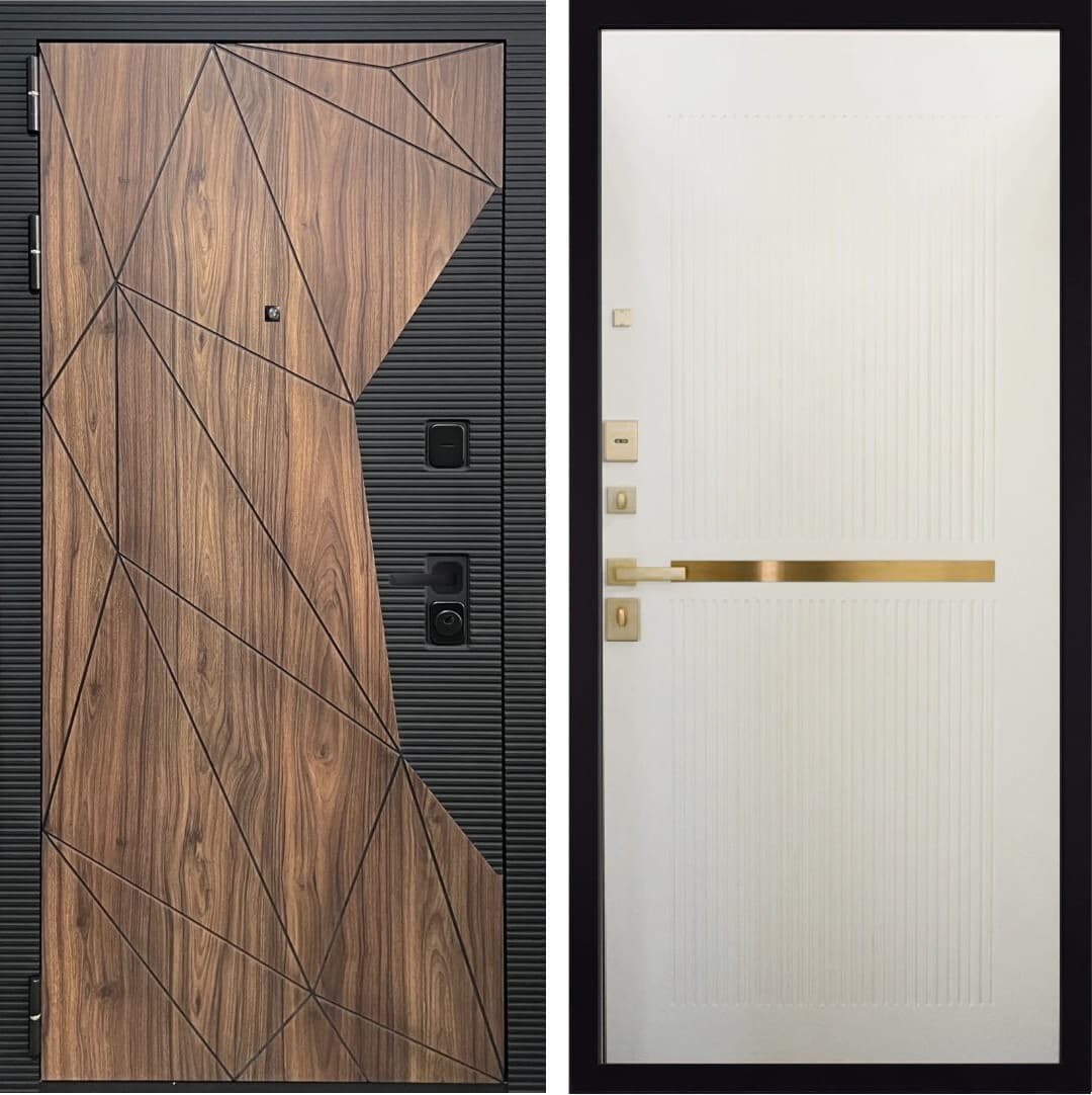 Снаружи дверь имеет красивую внешнюю декоративную панель, которую эстетично дополняют МДФ-наличники в тон панели. Декоративная накладка с логотипом двери, как защита от подделок, расположена на торце дверного полотна.