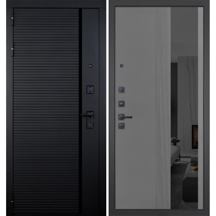 Снаружи дверь имеет красивую внешнюю декоративную панель, которую эстетично дополняют МДФ-наличники в тон панели. Декоративная накладка с логотипом двери, как защита от подделок, расположена на торце дверного полотна.